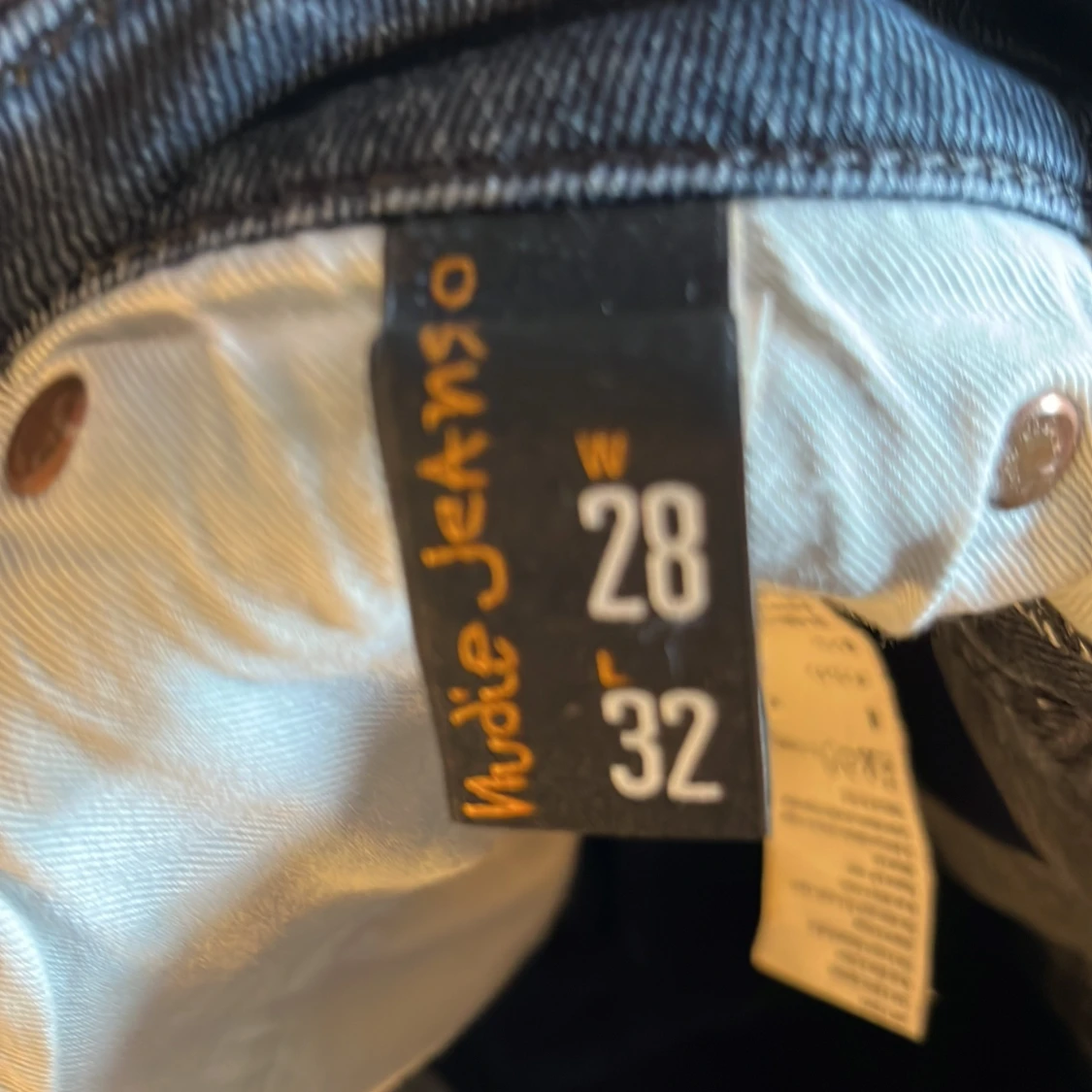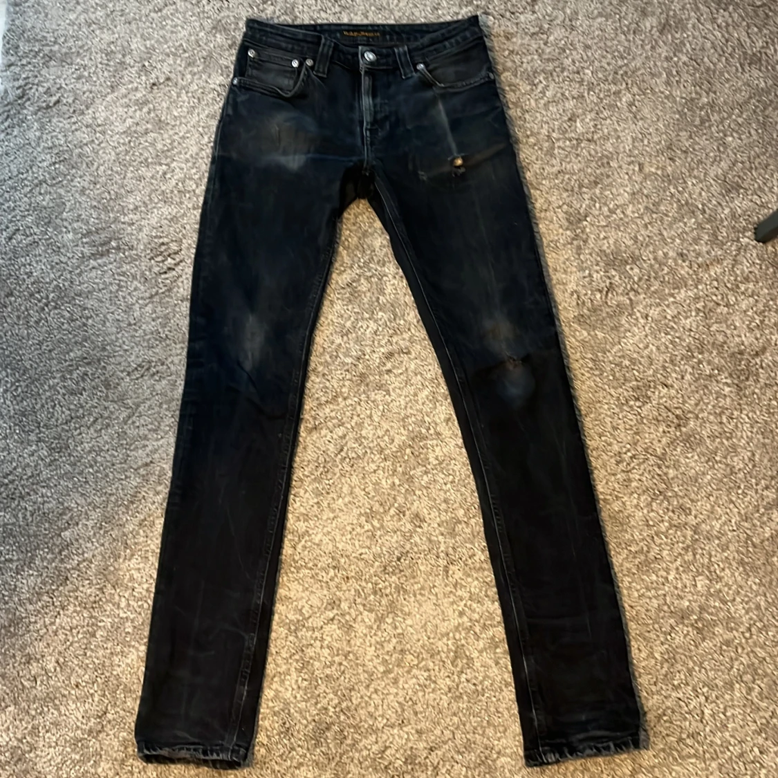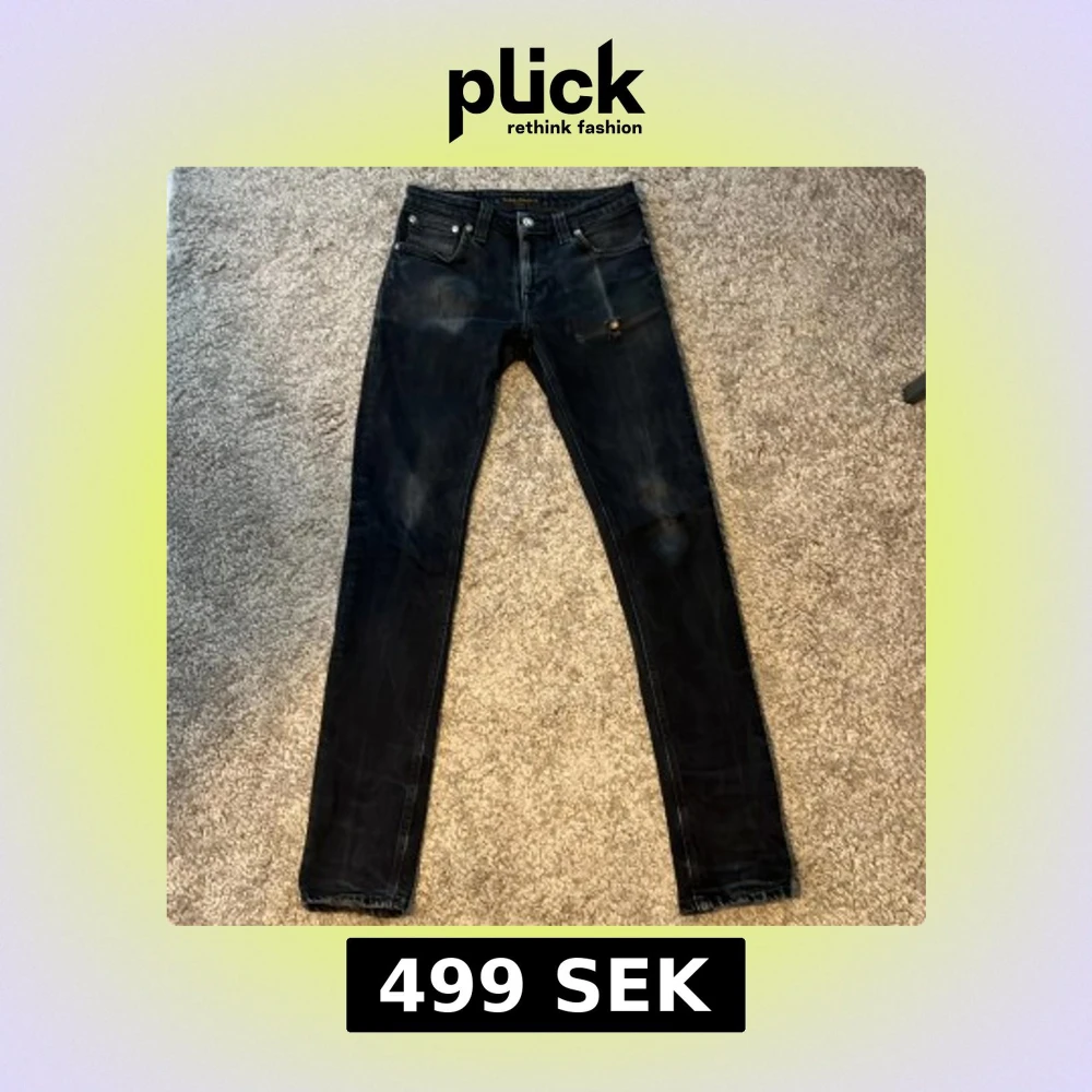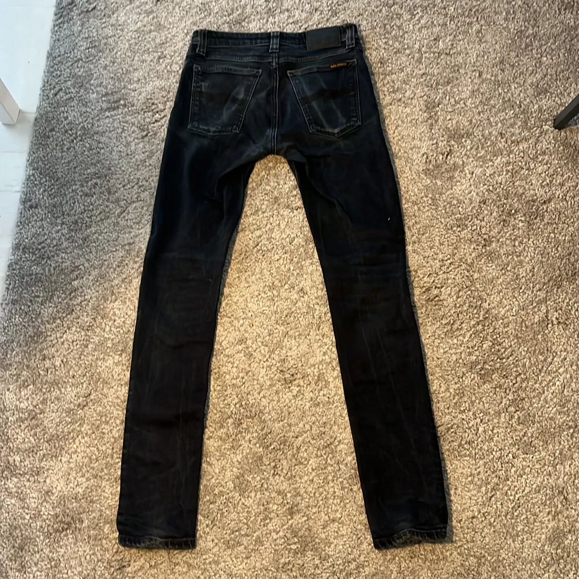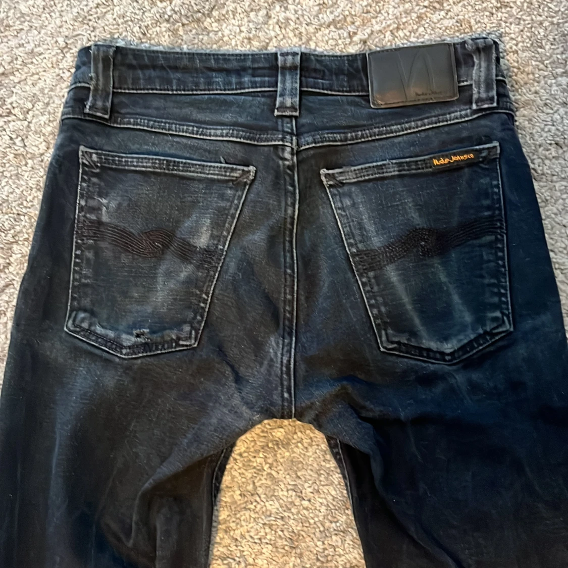 Tjena Säljer ett par svarta jeans från Nudie Jeans i storlek W28 L32. De har klassisk femficksdesign, snygga slitningar och Nudie-logga på bakfickan. Jeansen är tillverkade i stretchig denim för skön passform och har en mörk tvätt med coola detaljer. Kontakta vid frågor. Dem är lite skinny men det går att stretcha ut.