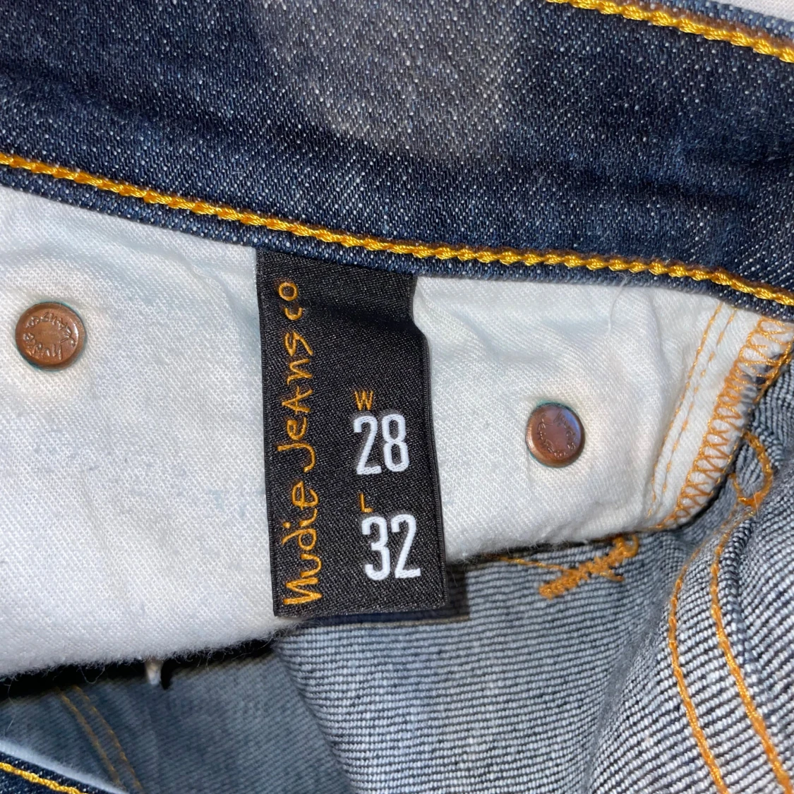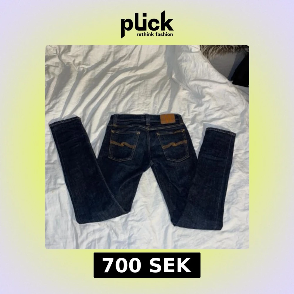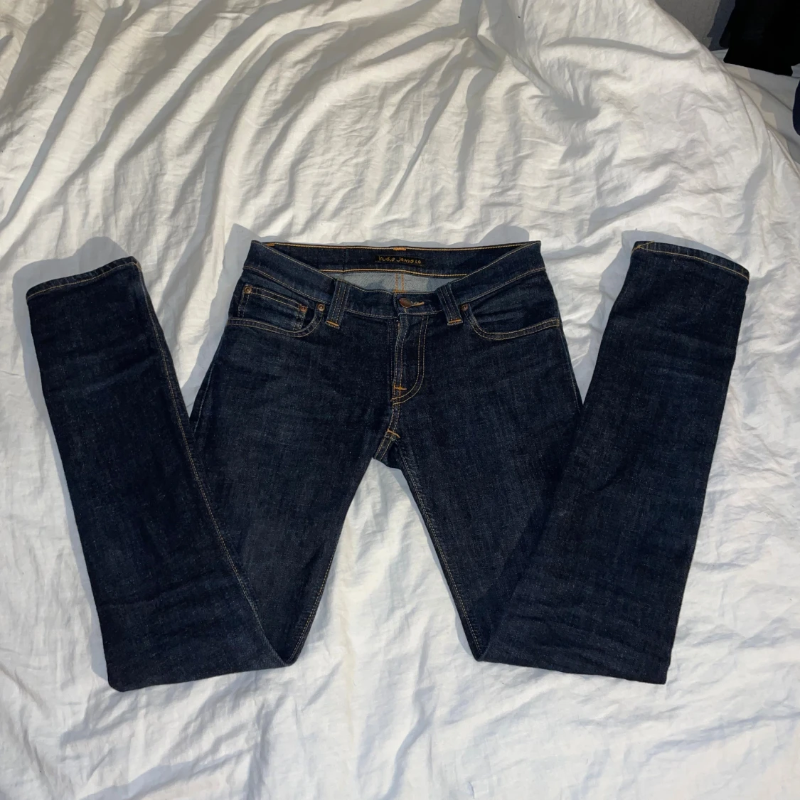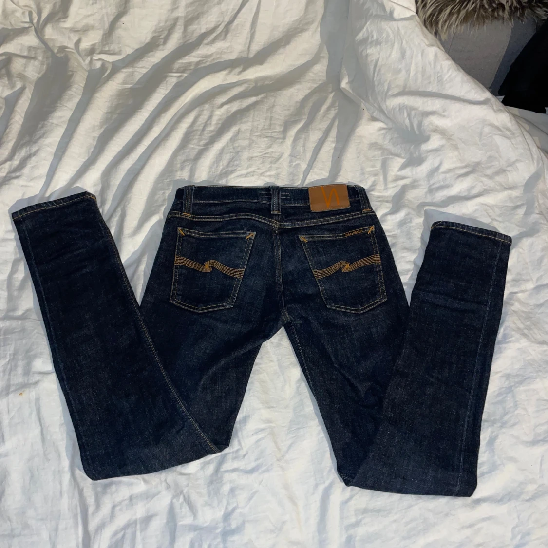 Snygga mörkblå jeans från Nudie Jeans med klassiska orange sömmar och ikoniska bakfickor. Modellen har en smal passform och raka ben. Tillverkade i slitstarkt bomullstyg, perfekta för dig som gillar stilrena och tidlösa jeans.