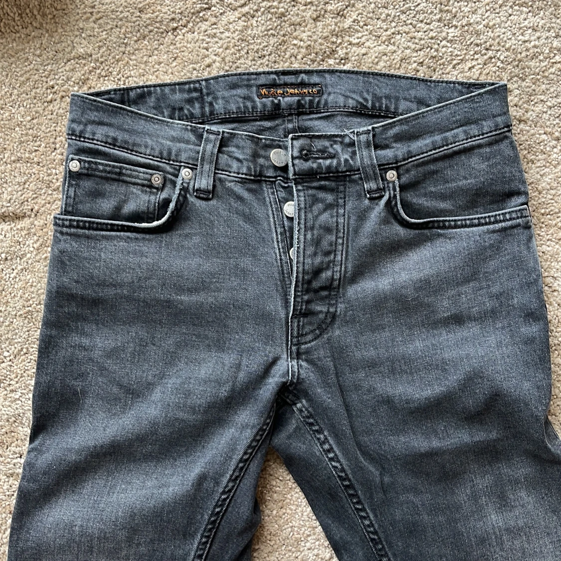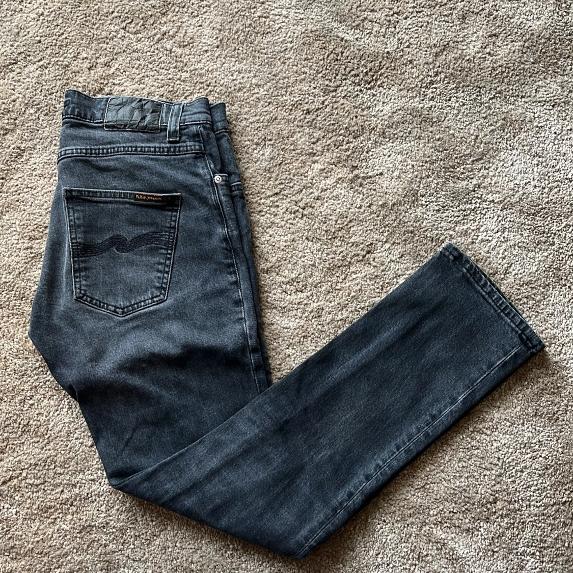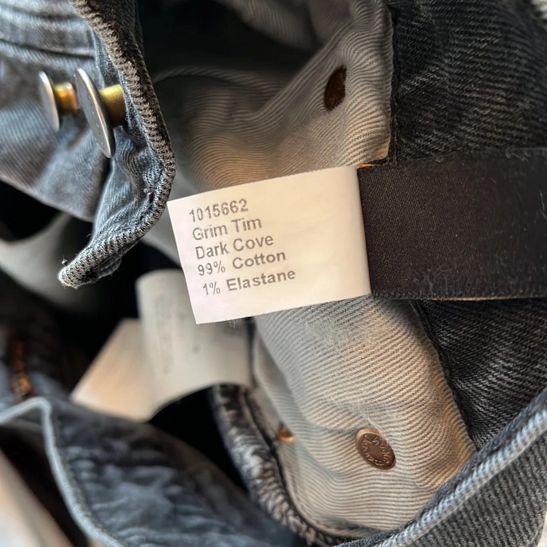 Snygga svarta/mörkgrå jeans från Nudie Jeans med klassisk slim fit passform . Jeansen har knappgylf och är i modellen ”Grim Tim”.