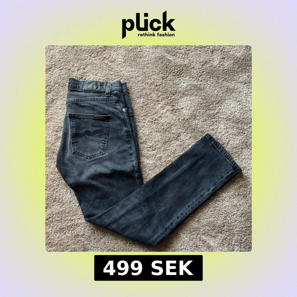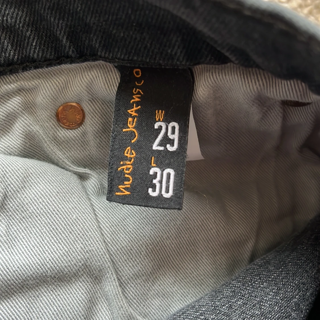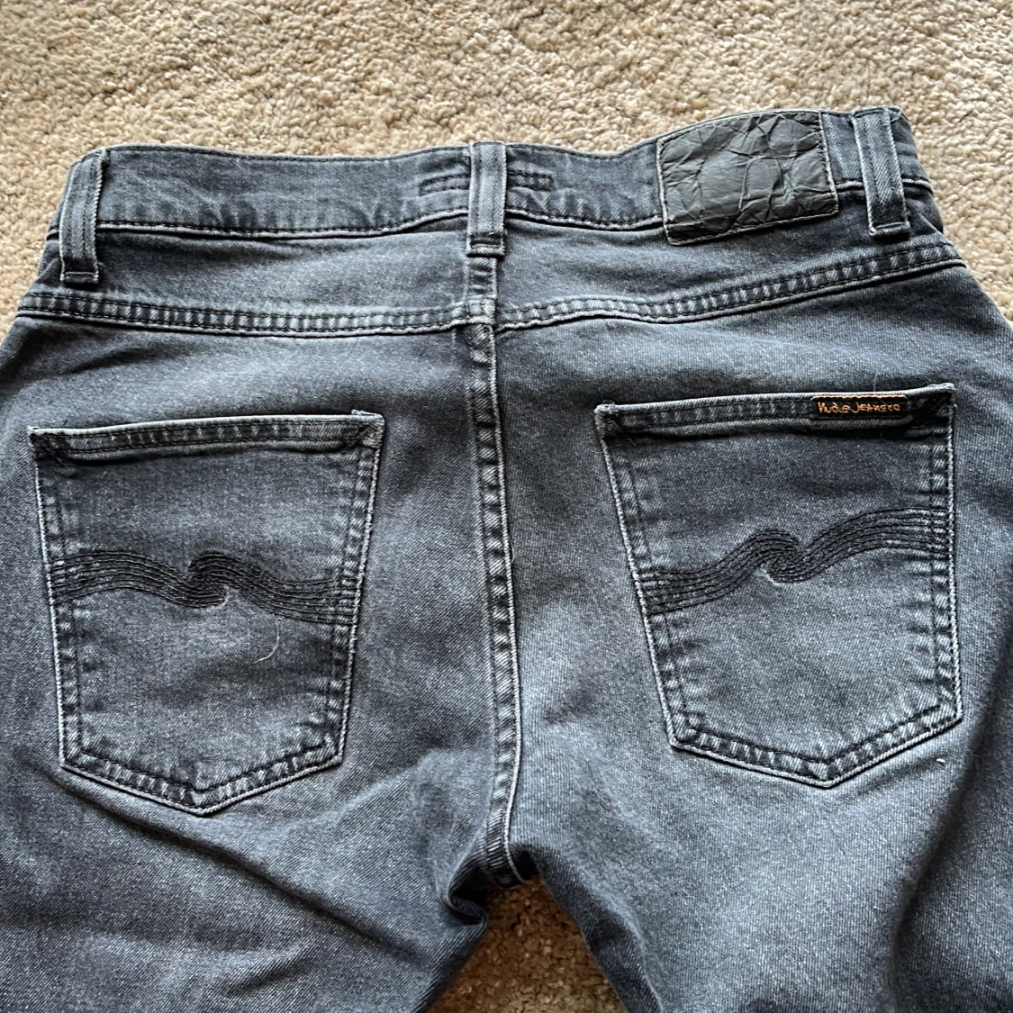 Snygga svarta/mörkgrå jeans från Nudie Jeans med klassisk slim fit passform . Jeansen har knappgylf och är i modellen ”Grim Tim”.