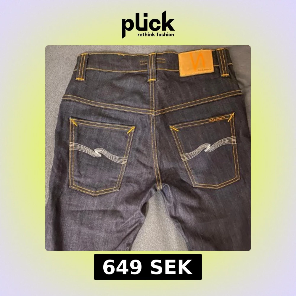 Snygga mörkblå jeans från Nudie Jeans med klassisk gul kontrastsöm och vågig brodyr på bakfickorna. Tillverkade i ekologisk bomull och har en rak passform. Perfekta för dig som gillar stilrena och hållbara jeans med schyssta detaljer.