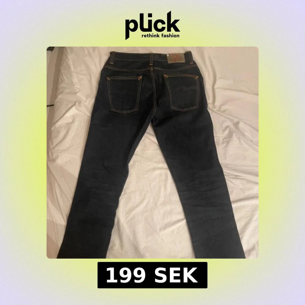 Säljer ett par mörkblå jeans från Nudie Jeans med klassisk femficksdesign och kontrastsömmar i orange. Jeansen har rak passform och är tillverkade i kraftigt denimtyg av bomull. Snygga detaljer på bakfickorna och Nudie-logga på bakre läderpatch.