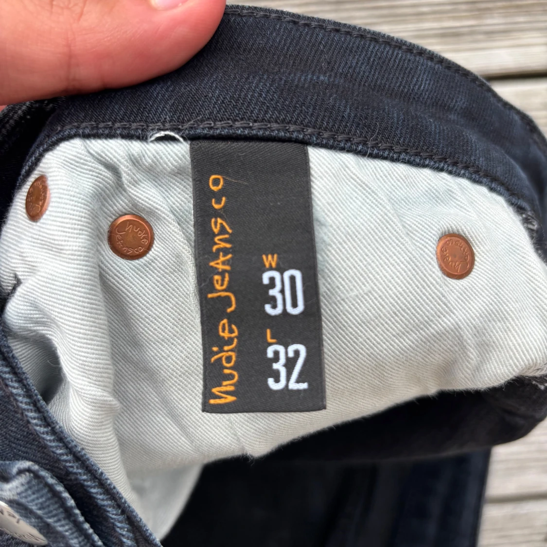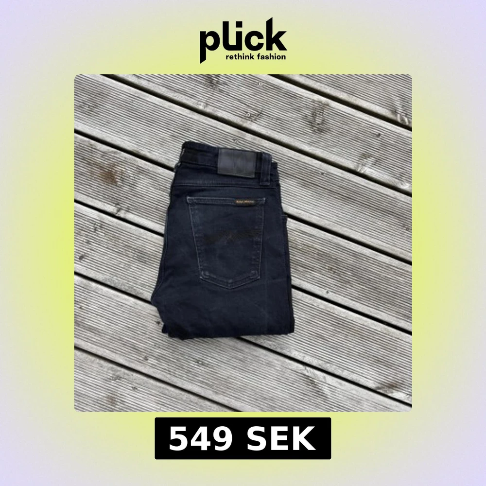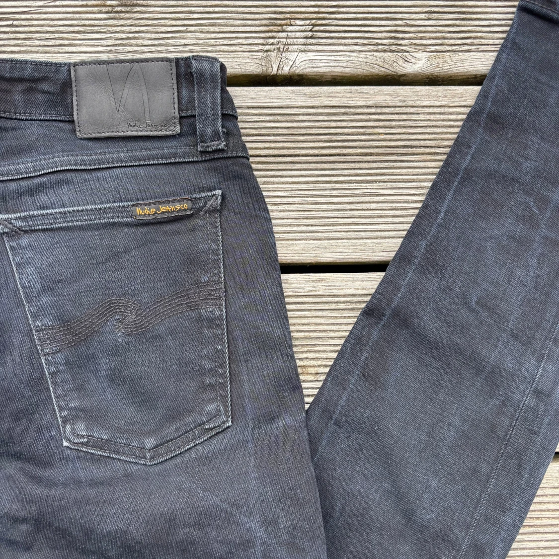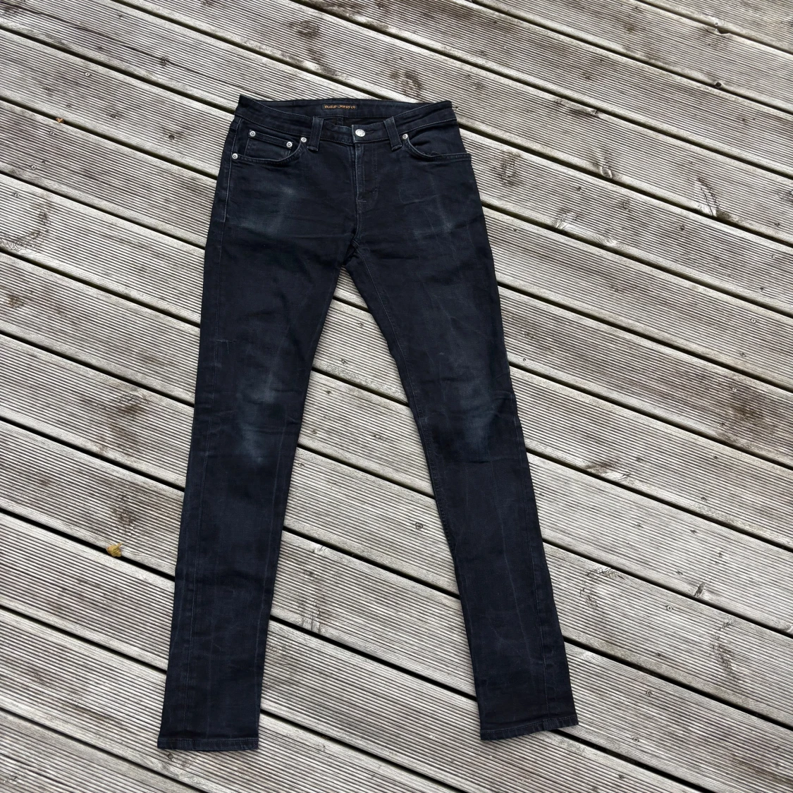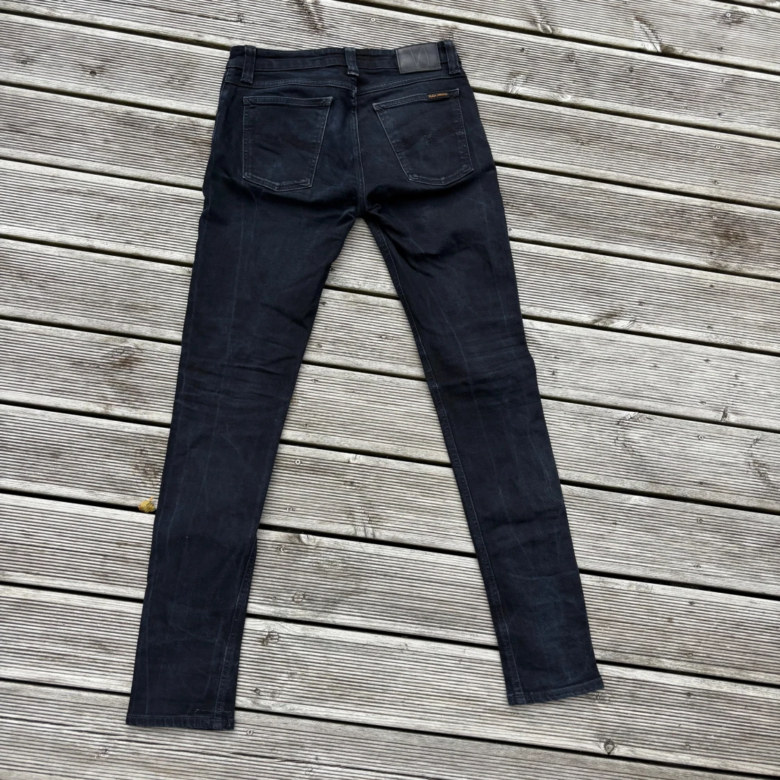 Säljer ett par svarta skinny jeans från Nudie Jeans med klassisk femficksdesign och snygga detaljer på bakfickorna. Jeansen har en mörk tvätt och är tillverkade i stretchig denim för skön passform. Perfekt för dig som gillar en smal siluett och stilren look. Kom gärna med frågor!🙌W30 L32
