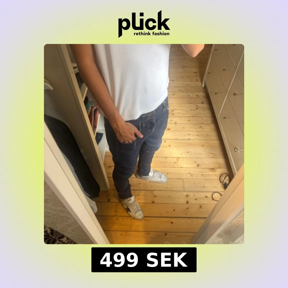 Säljer ett par mörkblå slim jeans från Nudie Jeans i storlek W30 L32. Jeansen har klassisk femficksdesign, orangea sömmar och sitter tight längs benen. Materialet är slitstarkt denim och passformen är riktigt snygg för dig som gillar smal siluett. Modellen är lean Dean