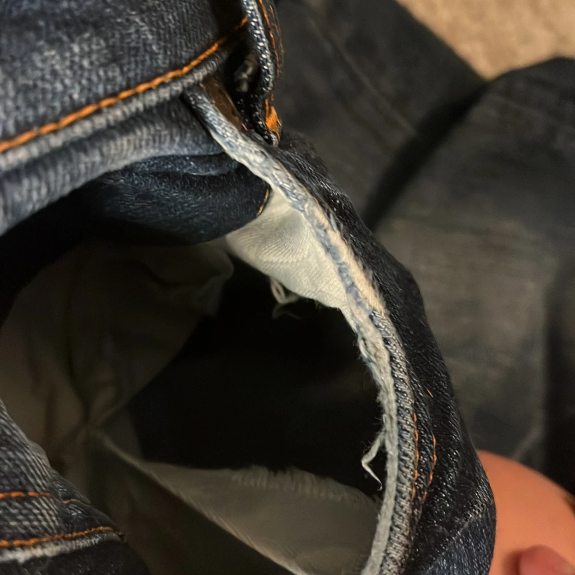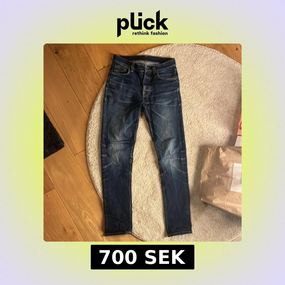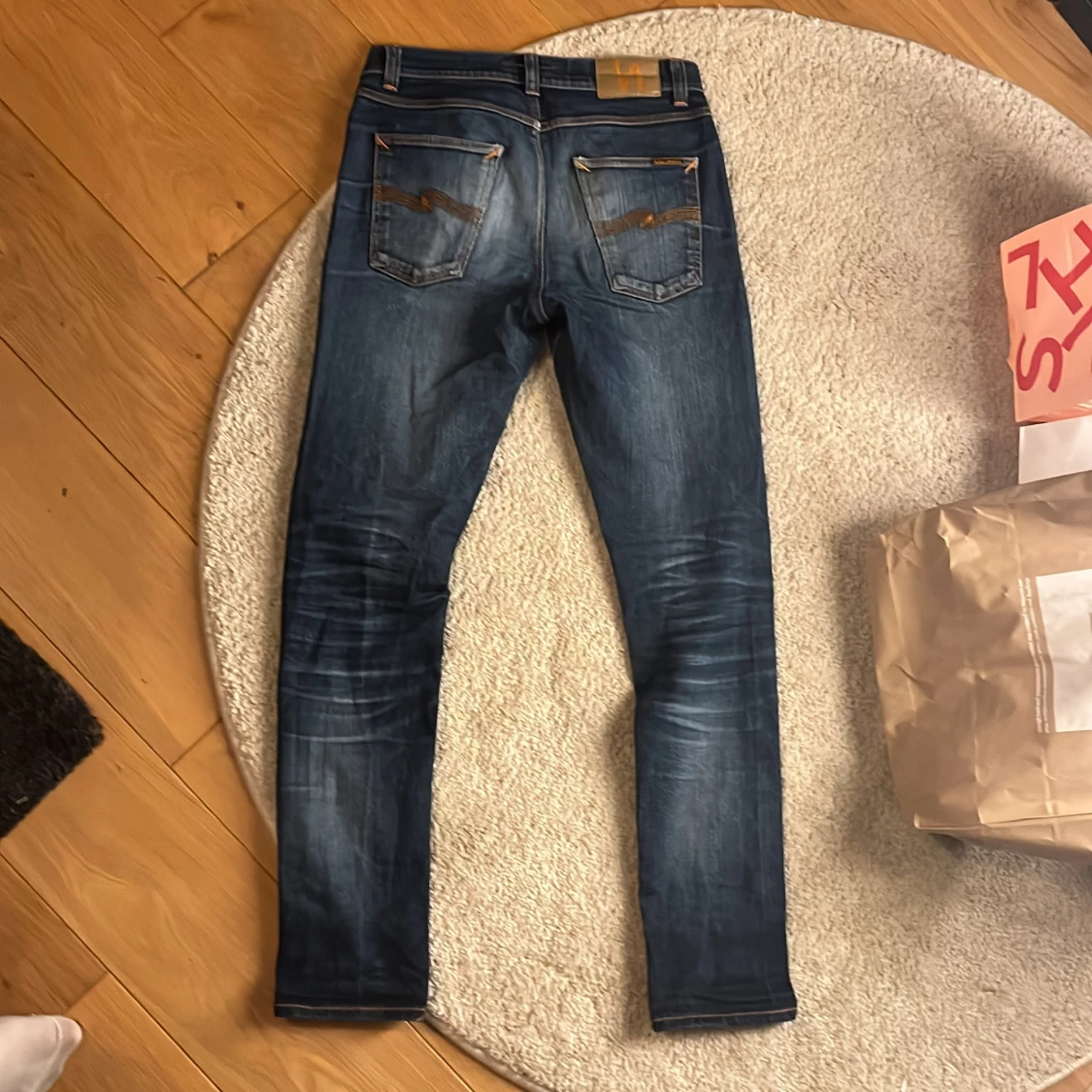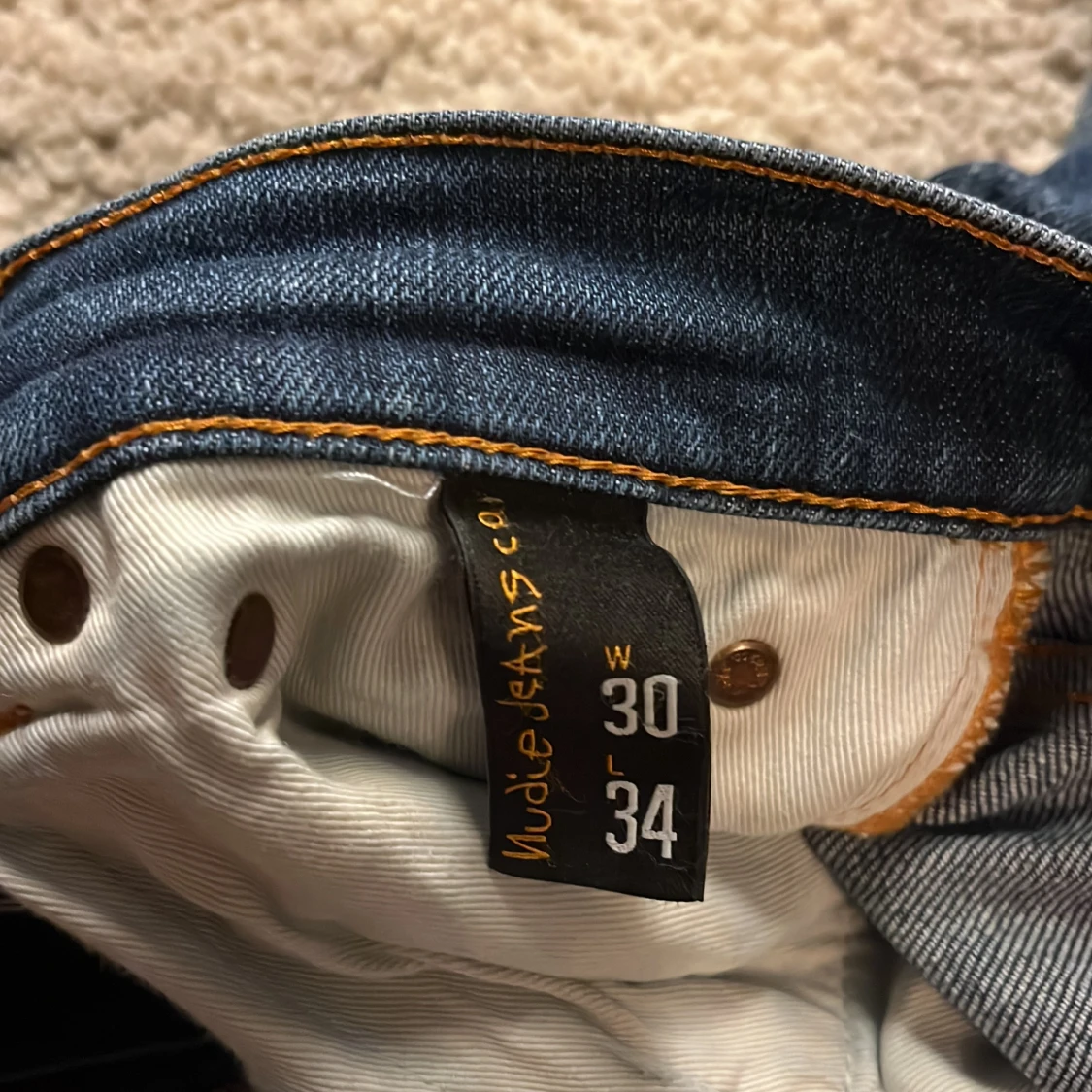 Snygga mörkblå jeans från Nudie Jeans i modellen slim fit. Galen honey comb och slitningar där fram håll i en av framfickorna men det går att fixa grattis vid en av nudies affärer då de har life time repears w30 l34