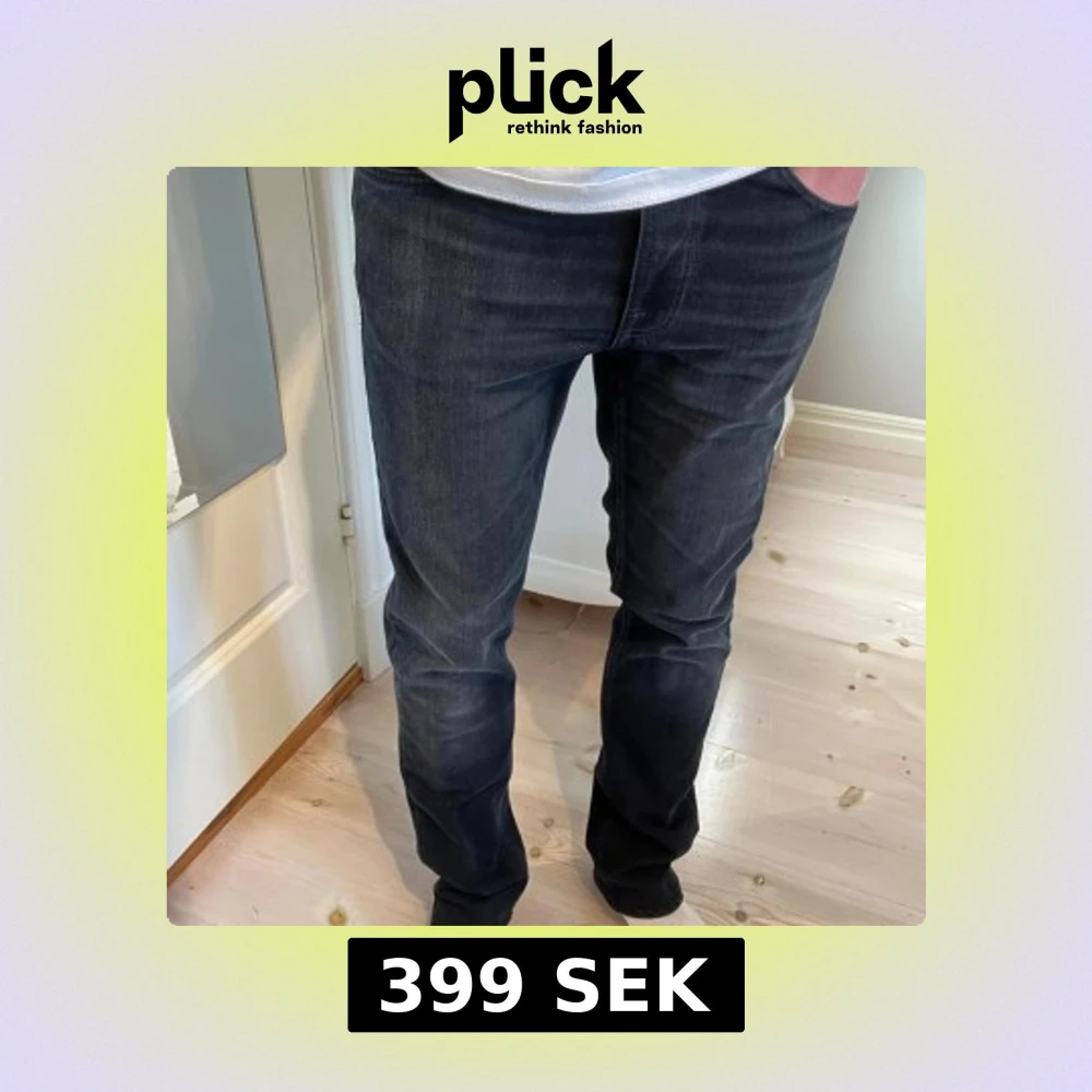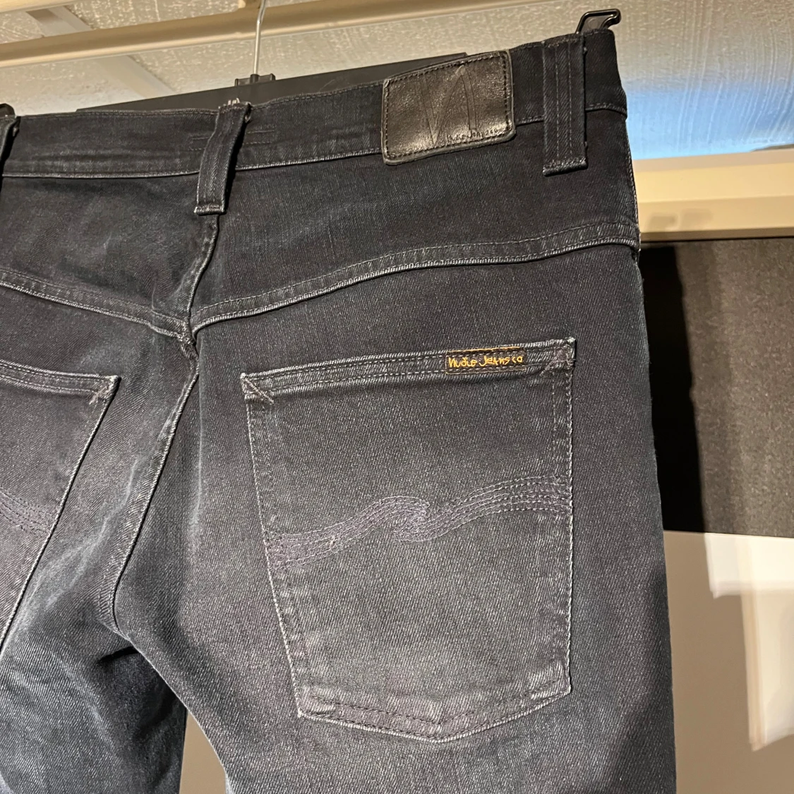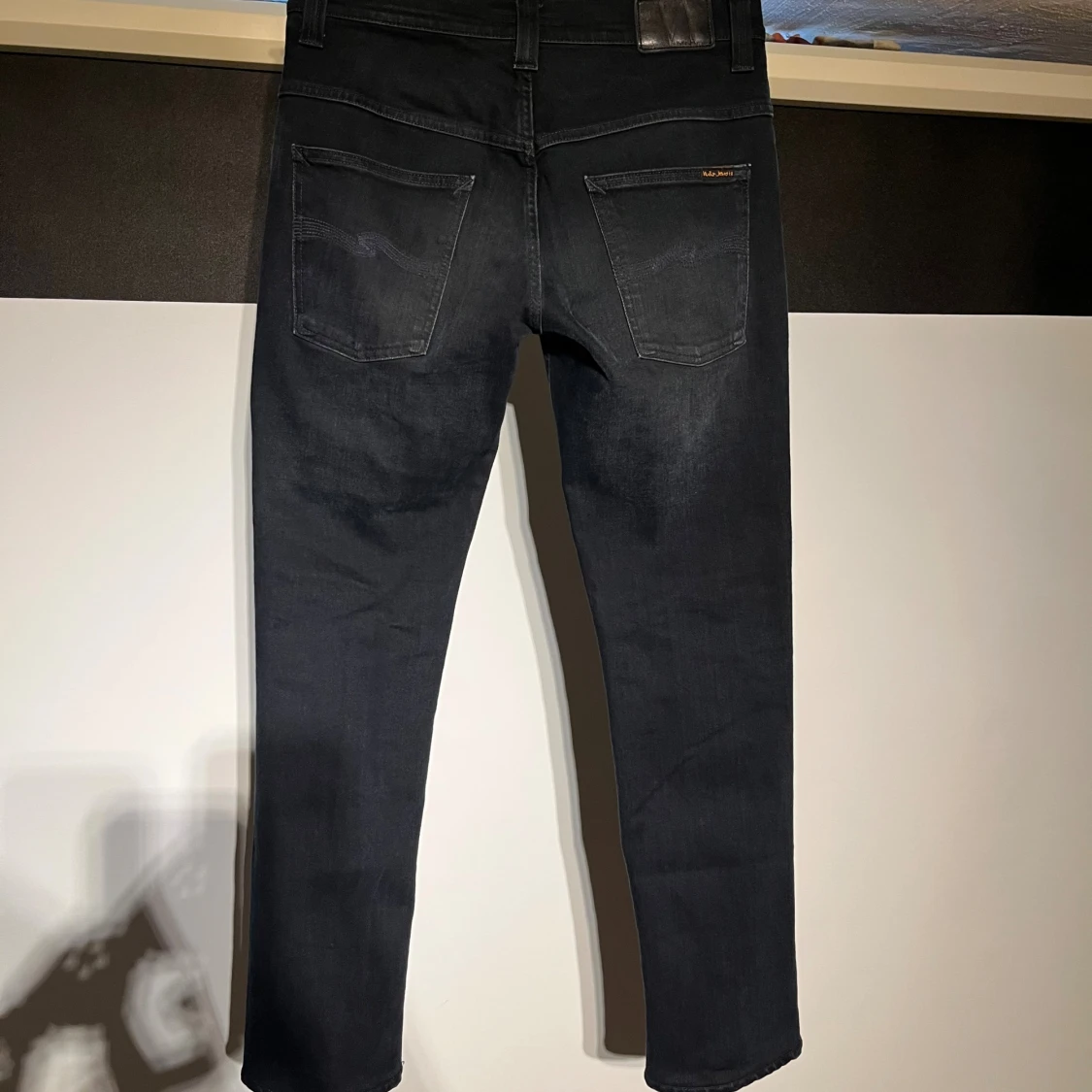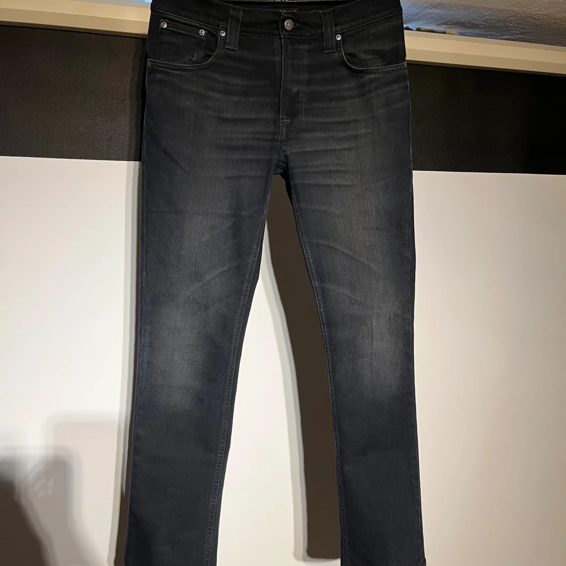 Snygga svarta blåa jeans från Nudie Jeans i modellen Thin Fin i mycket fint skick utan några defekter. Storleken enligt etiketten 31/32 men förkortade till ca 31/30 med bibehållen originalfåll. Längd 101cm. Midja 41cm. Ankel vidd 18,5.