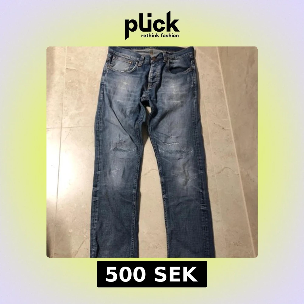 Säljer ett par blå skinny jeans från Nudie med slitningar och lagade detaljer på benen. Jeansen har klassisk femficksdesign, normal midja och är tillverkade i stretchig denim för en tajt passform. Snyggt tvättade med ljusare partier och Nudie-logga på bakfickorna.