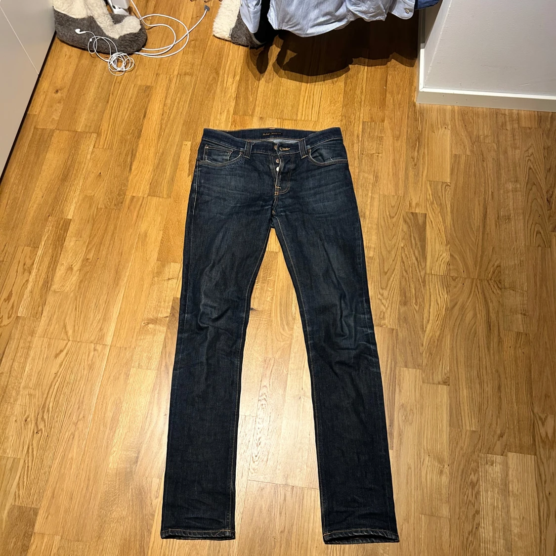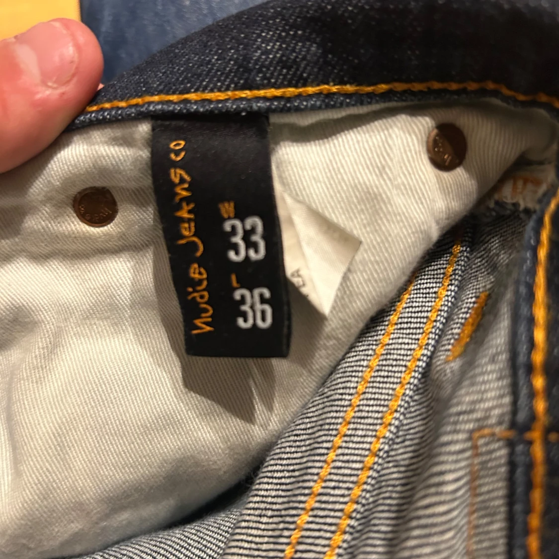 Säljer ett par Nudie Jeans Grim Tim i färgen Dry Navy. Jeansen är i storlek 33/36 men sitter mer som 31/34