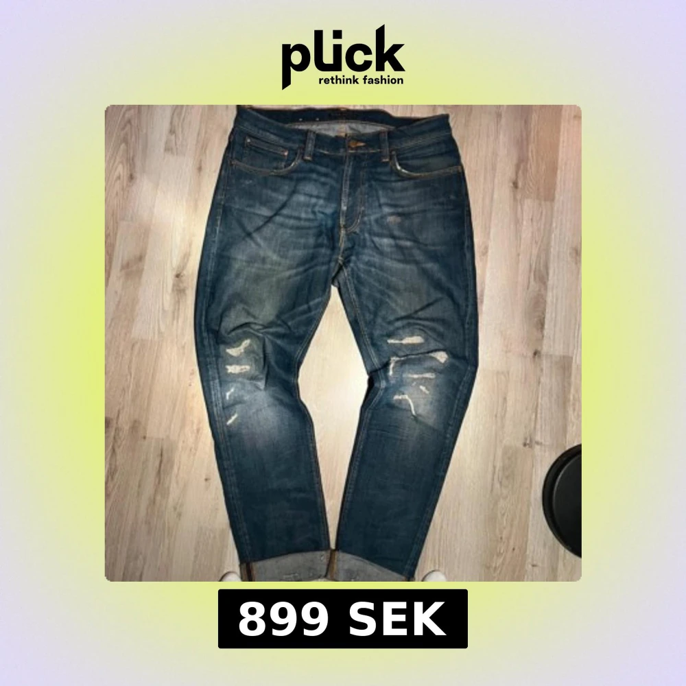 Säljer ett par blå jeans från Nudie med coola slitningar och lagom tvättad look. Jeansen har klassisk femficksdesign, uppvikta benslut och kontrastsömmar på bakfickorna. Perfekt för dig som gillar en avslappnad och trendig stil.