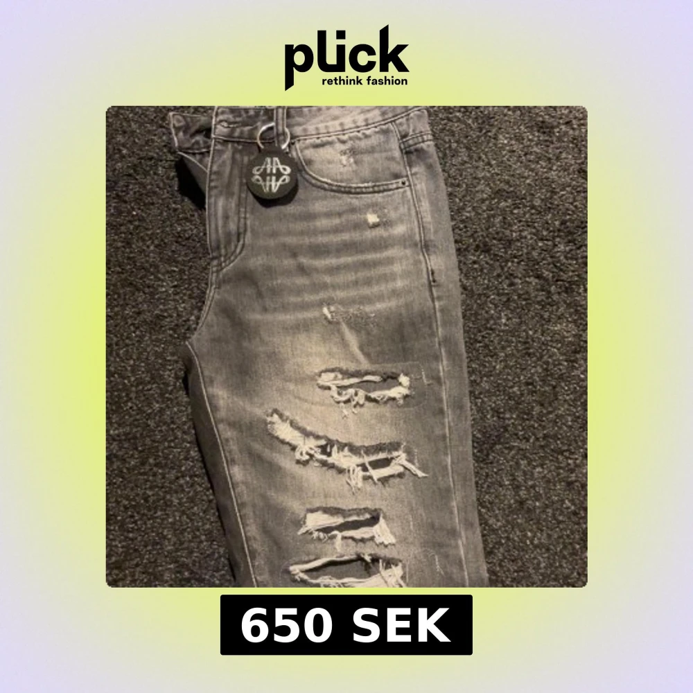 Säljer ett par grå jeans från Amicci med kraftiga slitningar och ripped detaljer längs hela framsidan. Slut sålda på hemsidan. Modellen har fem fickor, normal passform och klassisk jeansknäppning. Perfekt för dig som gillar en edgy streetstil.