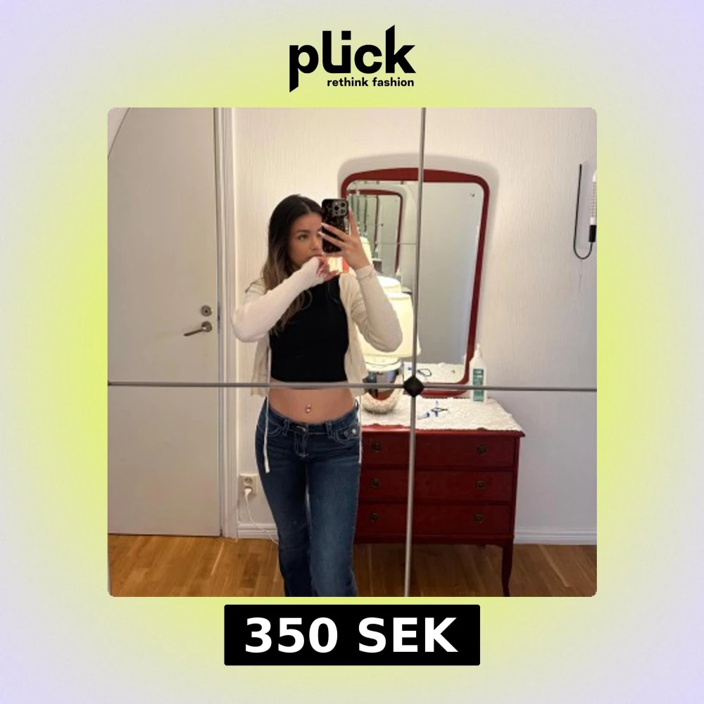 Säljer ett par mörkblå bootcut jeans med vita kontrastsömmar och klassiska fickor bak med lock och knapp. Jeansen har låg midja och en snygg passform som sitter tajt upptill och släpper vid benen. Perfekta för en avslappnad och trendig look. Är i helt nytt skick. Storleken är 158/164. Har resår band på insidan så går att justera storleken på midjan.