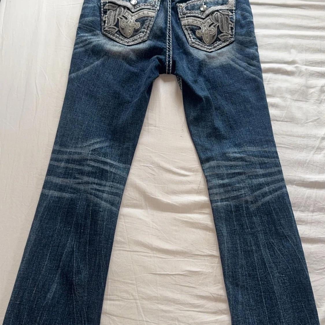 Säljer ett par blå jeans storlek 28 med snygga broderade och dekorerade bakfickor. Jeansen har låg midja, kontrastsömmar och bootcut-ben. Materialet är klassisk denim och detaljerna på fickorna ger en unik look. Nypris 2200 kr. Skriv vid intresse