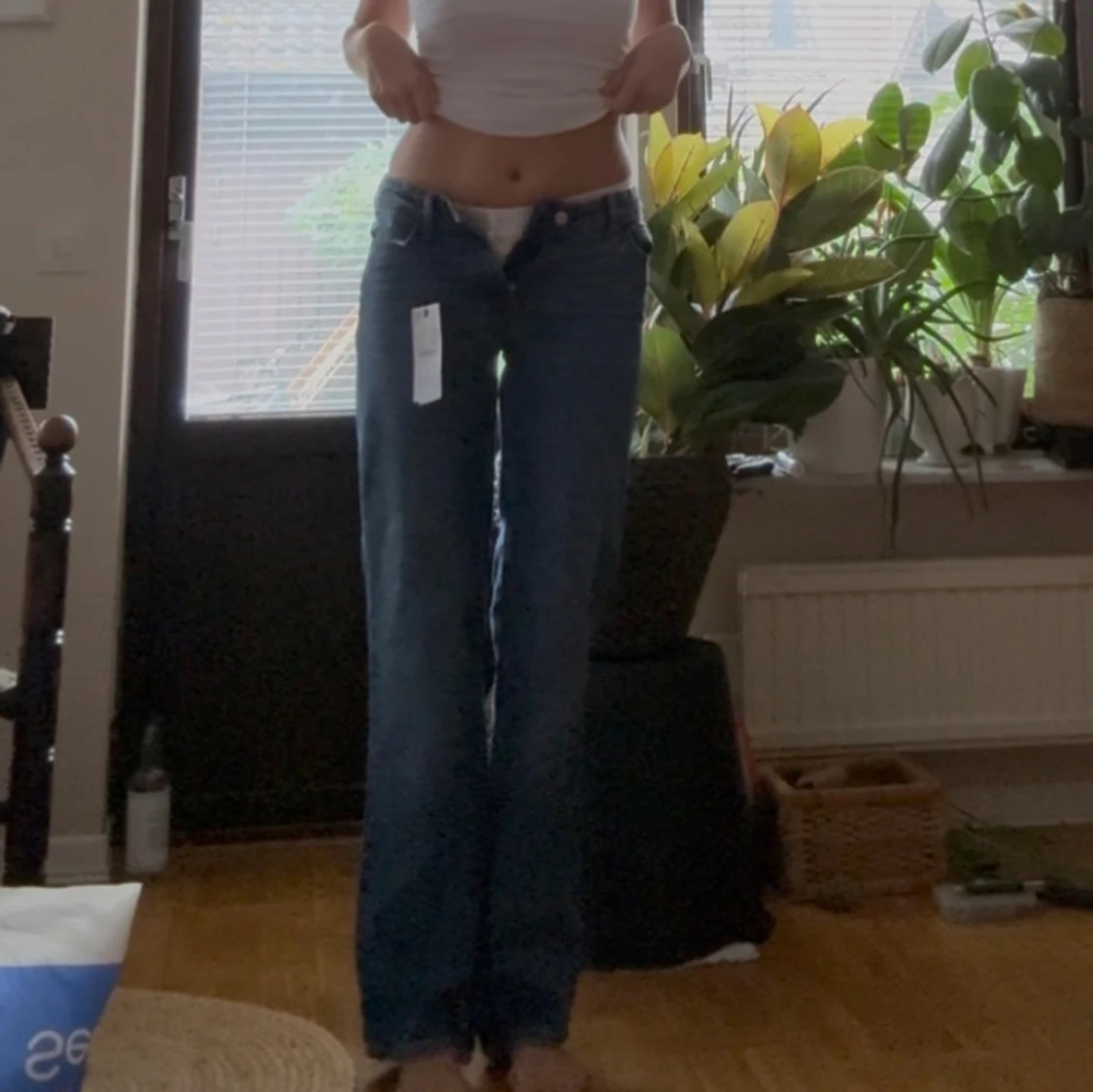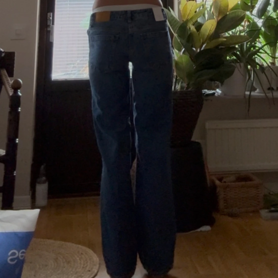 Säljer ett par klassiska blå jeans med rak passform och låg midja. Jeansen har fem fickor, bälteshällor och stängs med dragkedja och knapp. Materialet är robust denim i bomull och modellen är loose och straight. Perfekta för en avslappnad stil.
