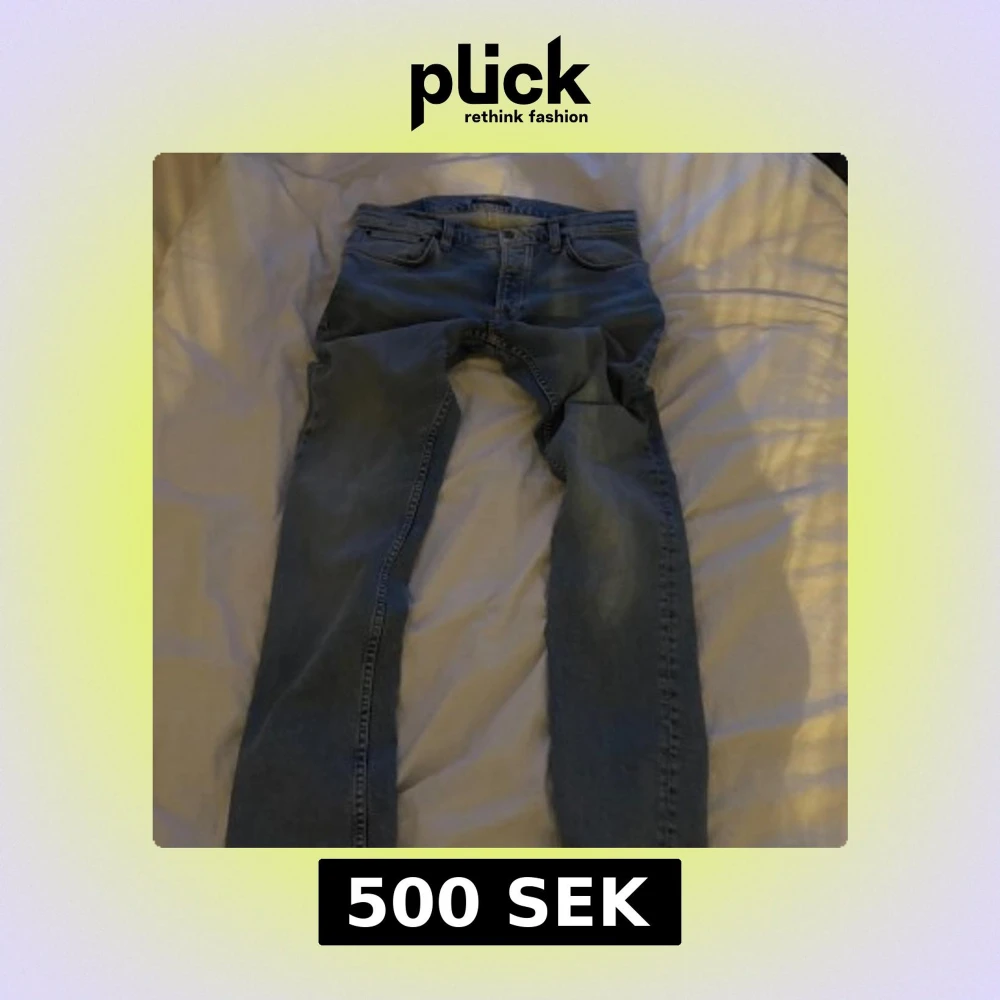 Säljer ett par ljusblå jeansbyxor från Nudie Jeans med klassisk femficksdesign och raka ben. Jeansen har normal passform och är tillverkade i denim med snygga detaljer på bakfickorna.