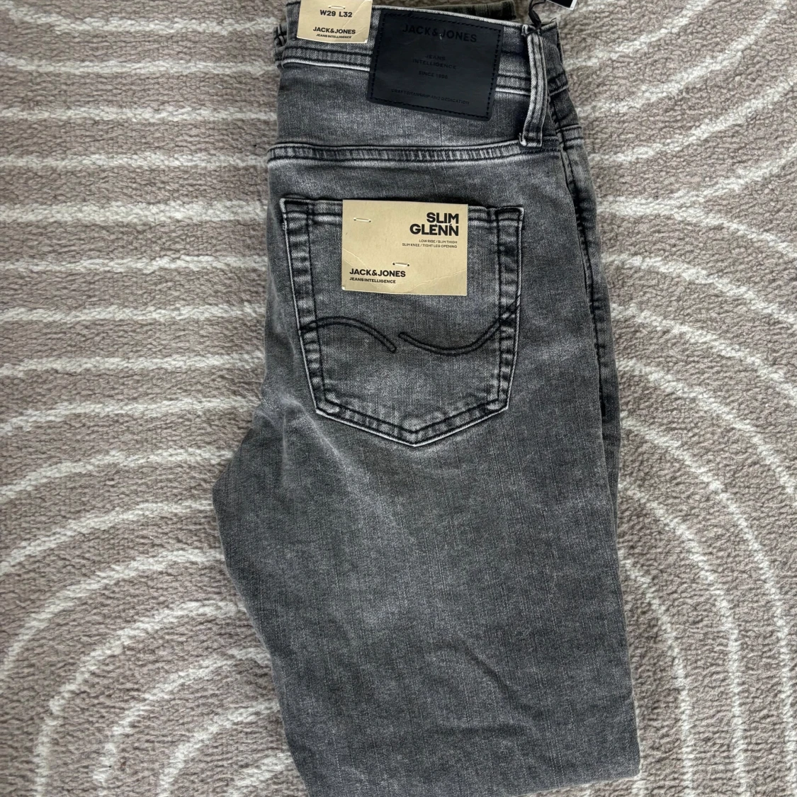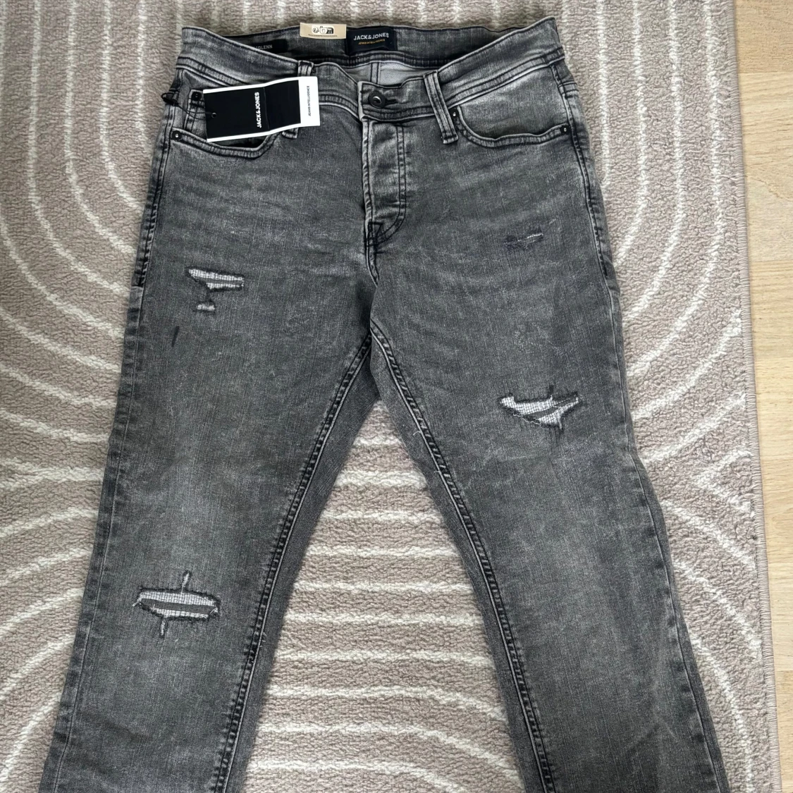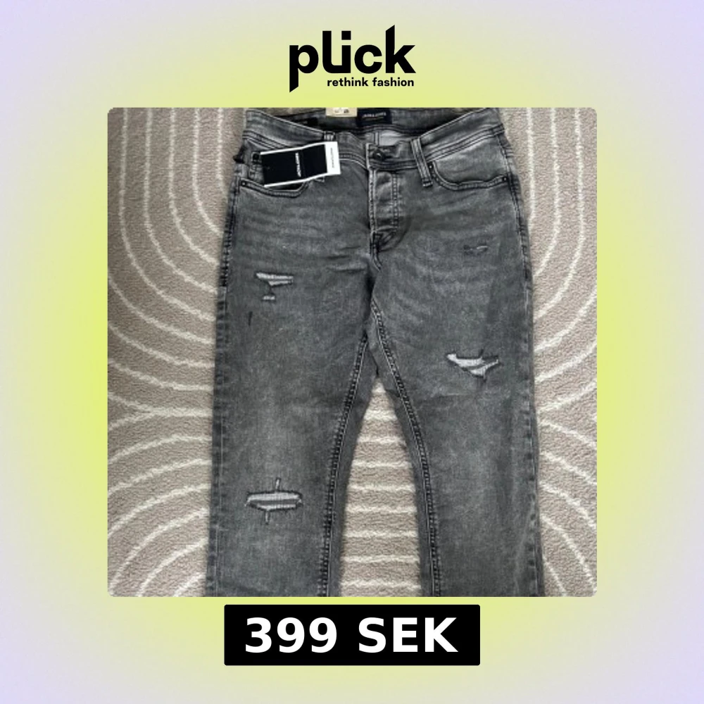 Snygga grå jeans från Jack & Jones i modellen Slim Glenn. Jeansen har slitna detaljer på benen och klassisk femficksdesign. De är slim fit och tillverkade i stretchig denim för en bekväm passform. Perfekta för en cool och avslappnad stil. Köpta tidigare för 900kr men ej använda så säljer för 50% även fast lappen är kvar.