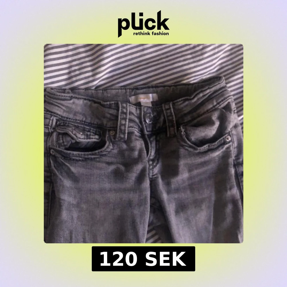 Snygga grå jeansbyxor med klassisk femficksdesign och knappgylf. Perfekta för en avslappnad stil. Populära lågmidjade bootcut jeans från Gina. Pris kan diskuteras