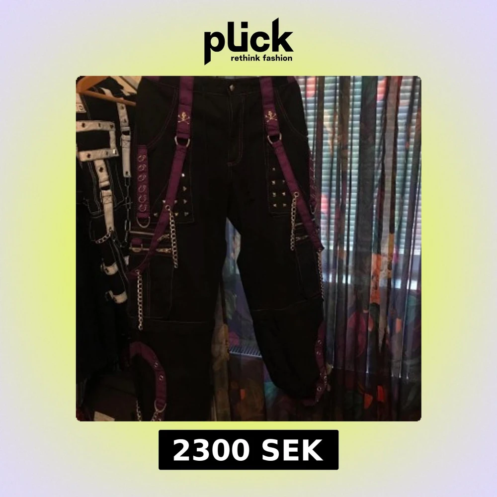 Svarta cargopants från Tripp NYC med lila detaljer, nitar, kedjor och remmar. Byxorna har flera dragkedjor och fickor, samt coola metalldetaljer och lila sömmar. Perfekta för dig som gillar alternativ stil och vill sticka ut.