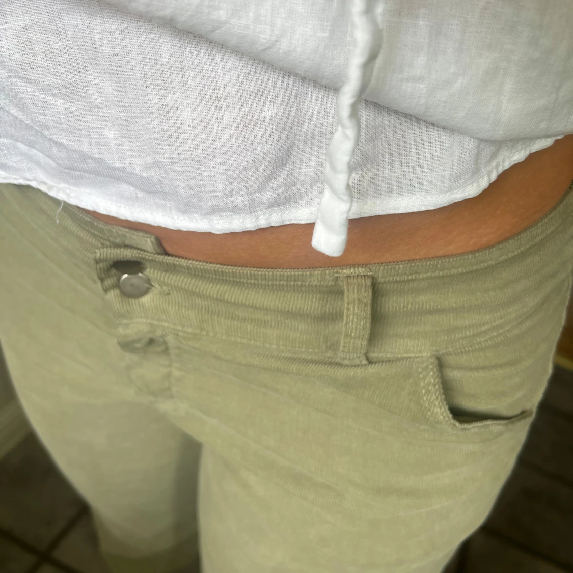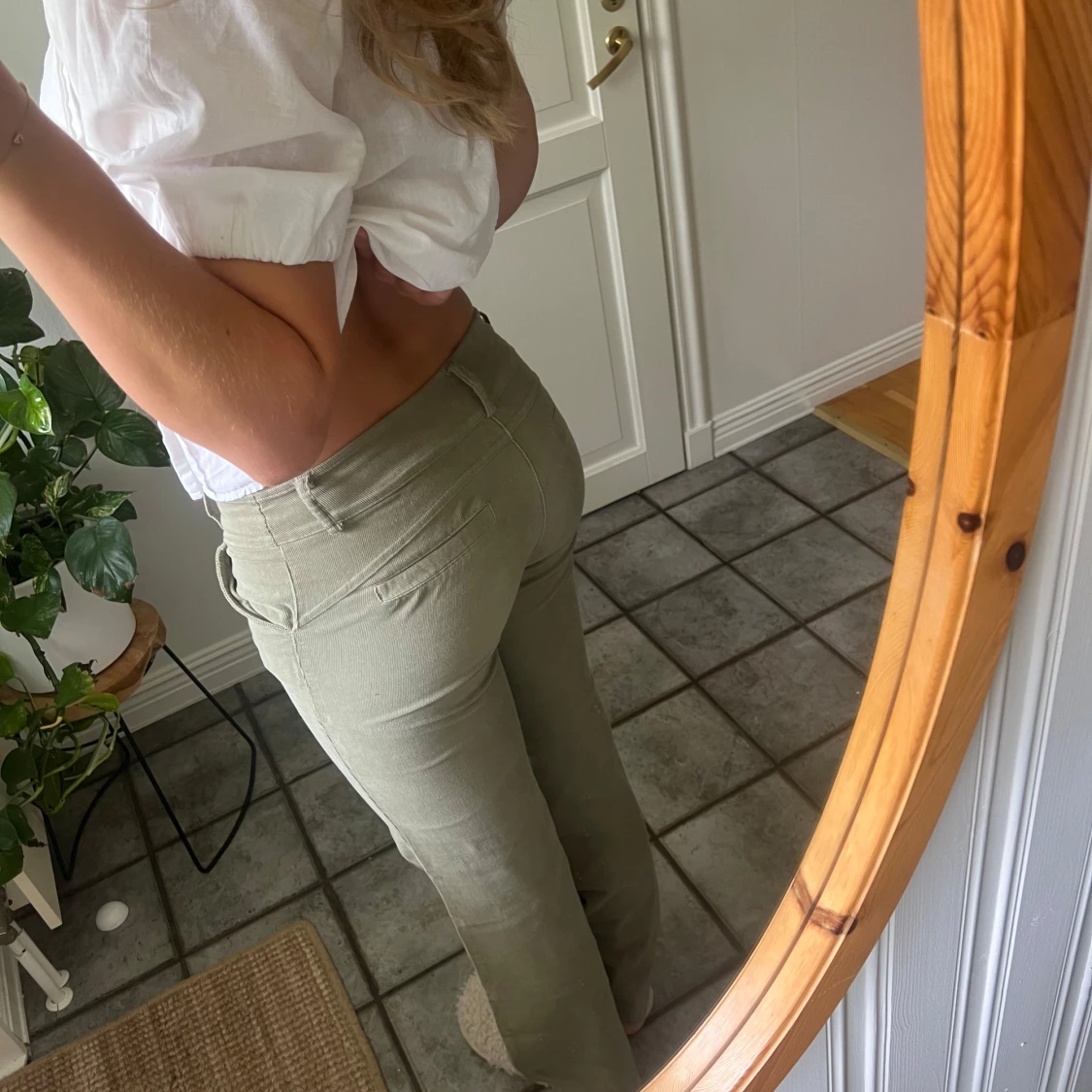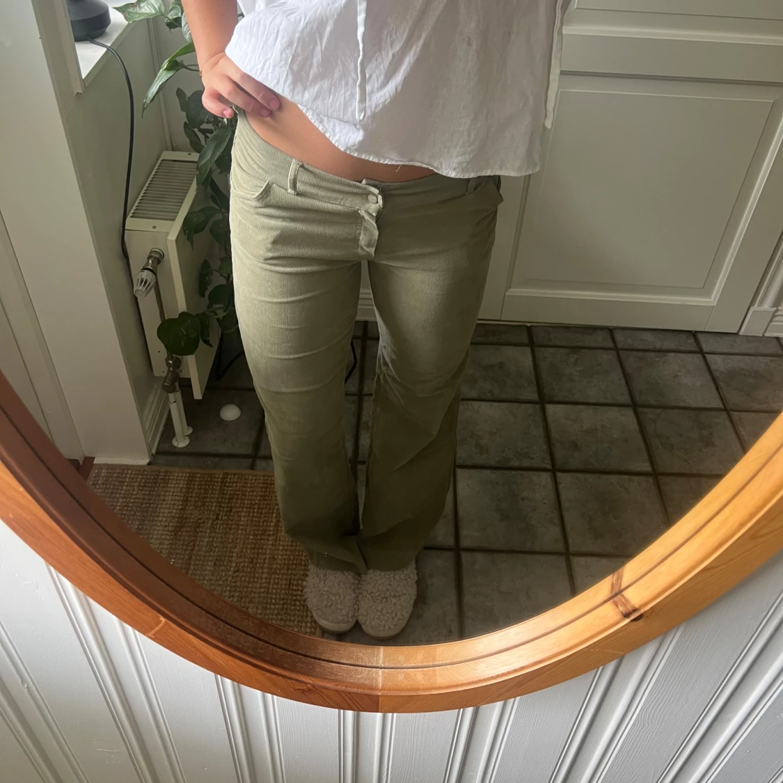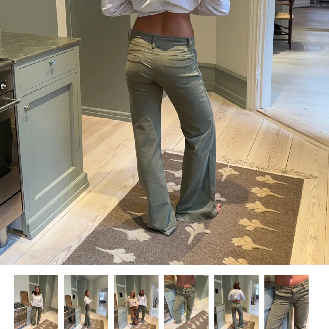 Snygga gröna byxor med låg midja och vida ben. Byxorna är väldigt nya och använda Max 3 gånger. Mer information finns på Design By Si❣️Väldigt bekväma och snygga, men något för små för mig vilket gör att jag nu vill sälja de till ett bra pris😍Skriv för fler bilder 🙌🏼