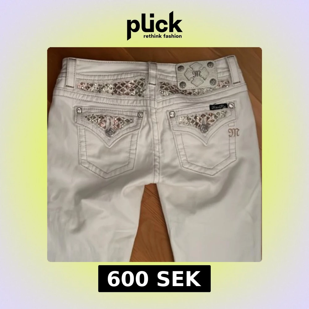 Snygga vita jeans från Miss Me med glittrande paljettdetaljer på bakfickorna och bältet. Byxorna har en lågmidjad passform och är dekorerade med knappar och broderade detaljer. Perfekta för att sticka ut med en unik stil!!💓💓Midjemått rakt över: 37cm, innerbenslängd, 75cm. De är skinny men är enkla att sy ut till bootcut. Säljer bara då färgen inte passar mig!