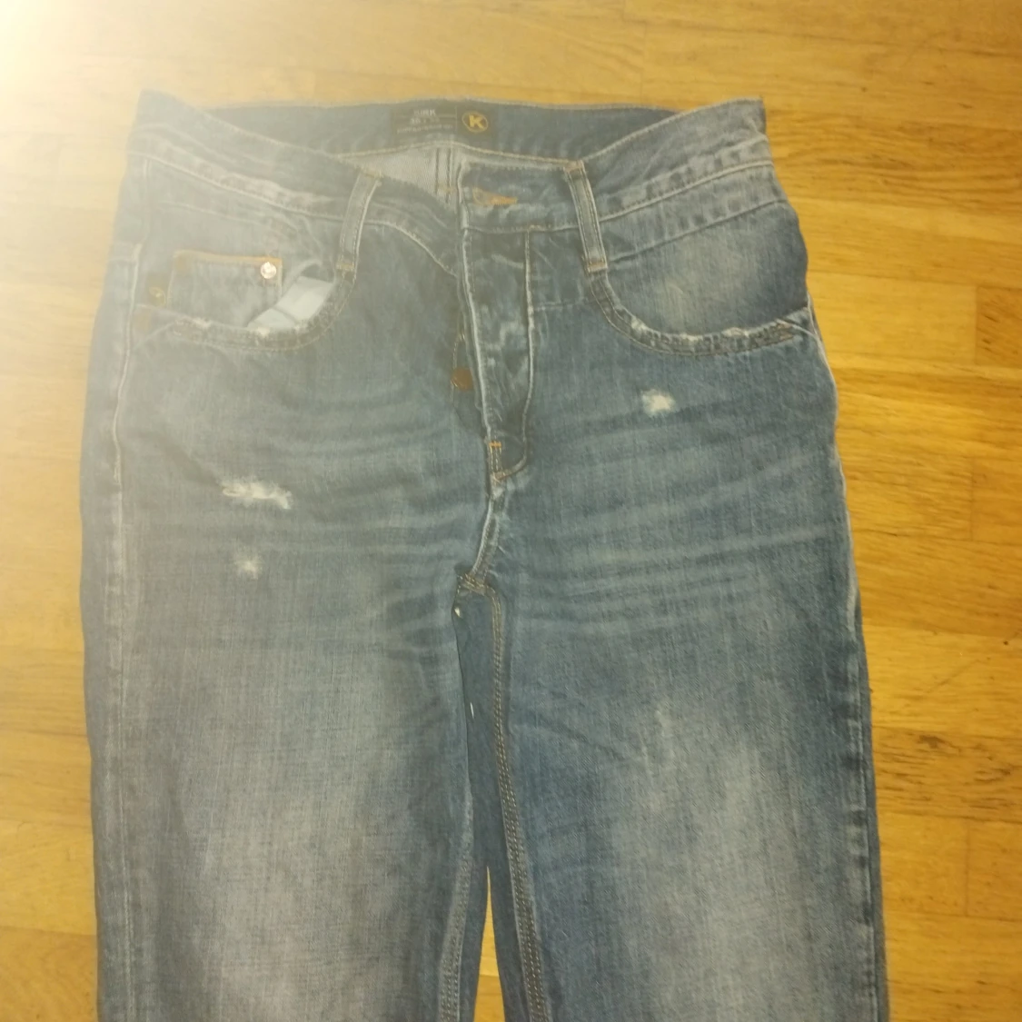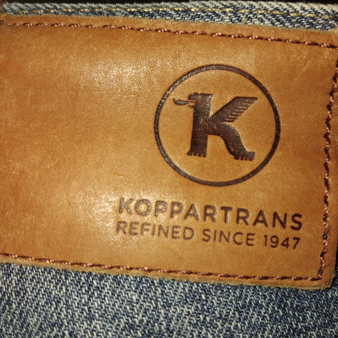 Säljer ett par klassiska blå jeans från Koppartrans, modell Kirk. Jeansen har snygga slitningar, fem fickor och kontrastsömmar. Märkespatch i läder baktill och coola detaljer vid fickorna. Perfekt för dig som gillar en tidlös denimlook.