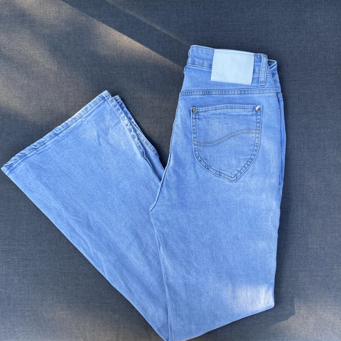 Ljusblå jeans med låg midja och V-ringning. Användt få gånger och är i fint skick. Köpt från Oh Polly i storlek UK 10, passar som S eller en liten M.