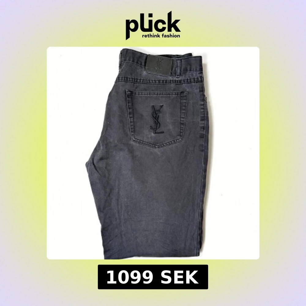 Vintage Saint Laurent jeans med snygg klassiska YSL loggan på bakfickan. Ingen sizetag, mått - Längd 99 cm, midja 45 cm, benöppning 22,5 cm. Retail idag: ~8,000 SEK.