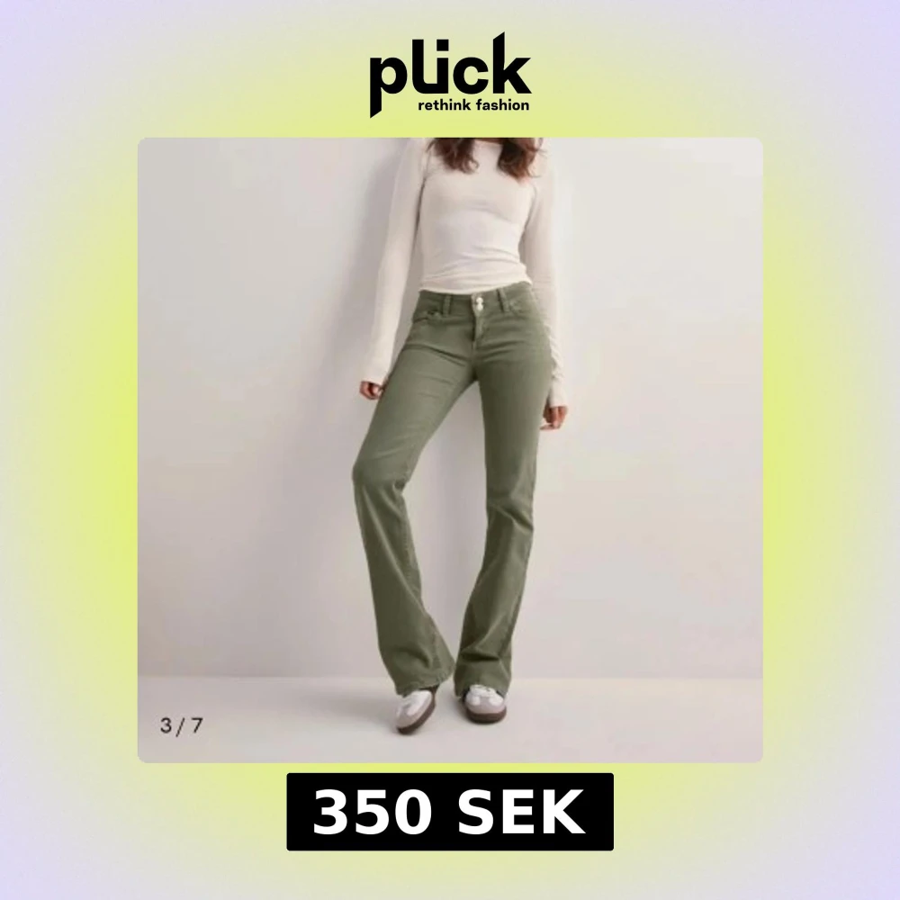 Snygga olivgröna byxor med bootcut och låg midja från Nelly:) Köpte för ca 6 månader sen men kan inte längre använda pga dom har blivit för små. Bra skick och inga tydliga tecken på användning💗