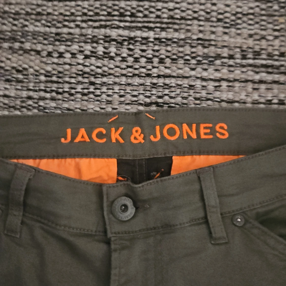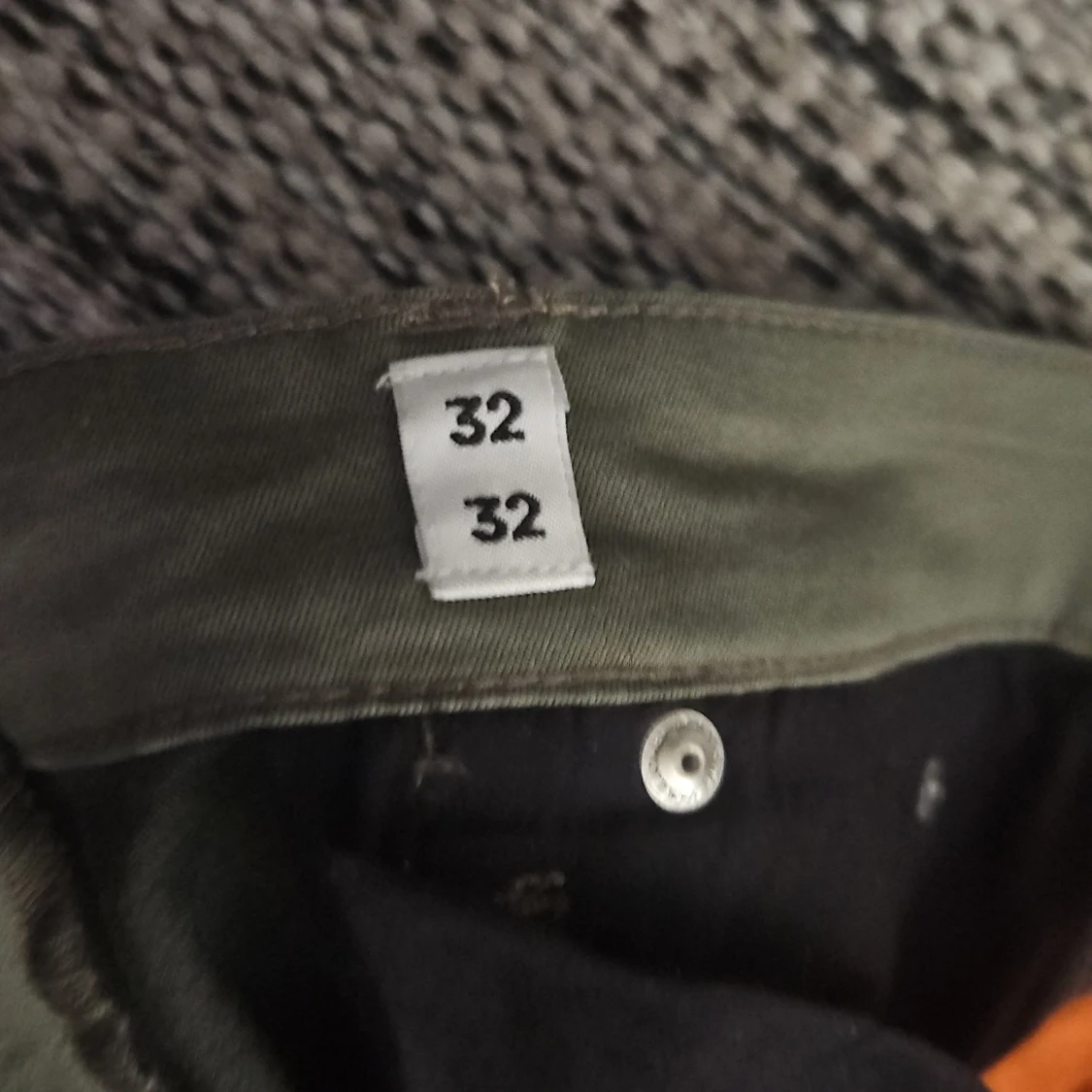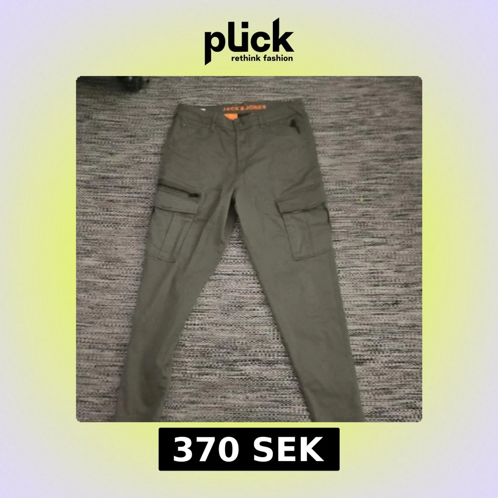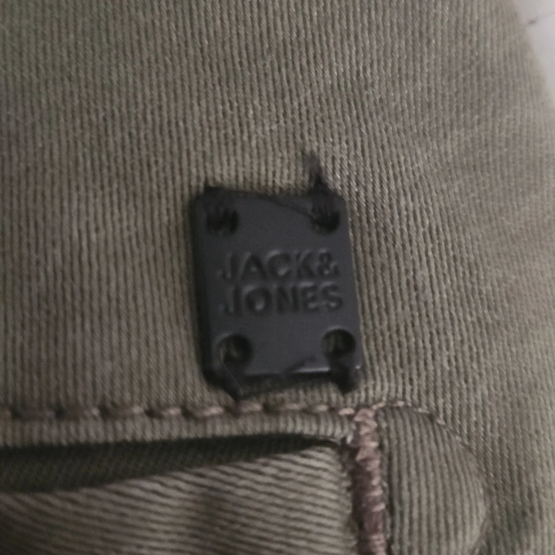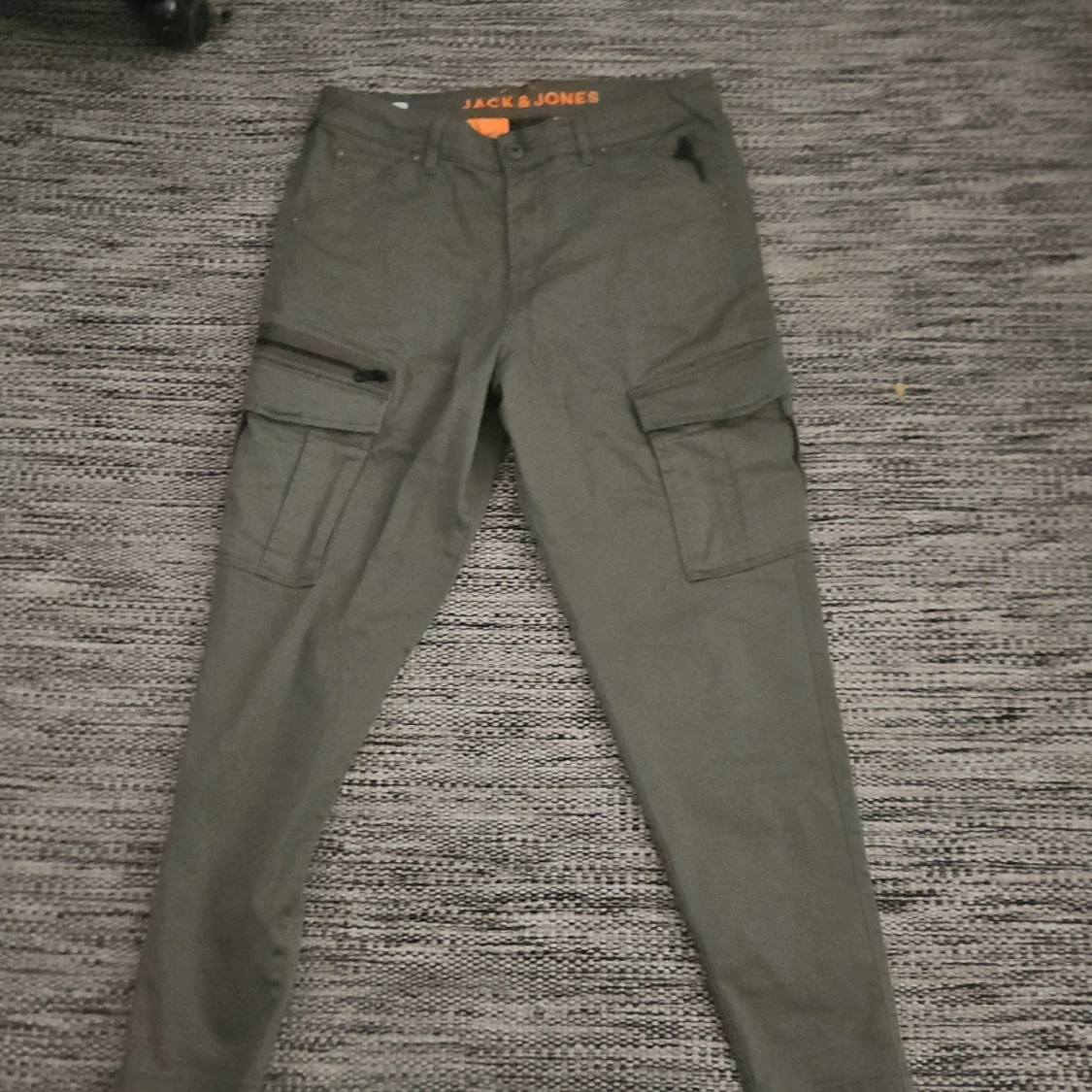 Säljer ett par olivgröna cargopants från Jack & Jones i storlek 32/32. Byxorna har flera stora fickor på sidorna och klassisk cargostil. Materialet är bomull och passformen är normal med raka ben. Perfekta för en avslappnad streetlook.