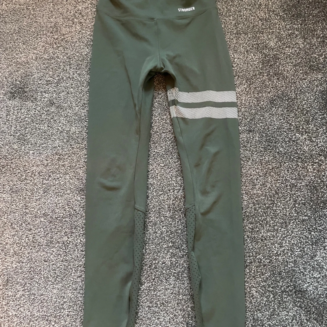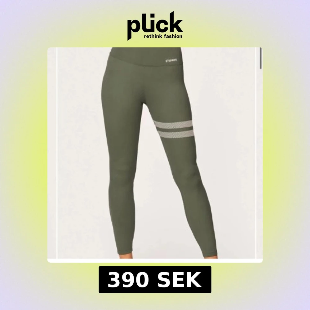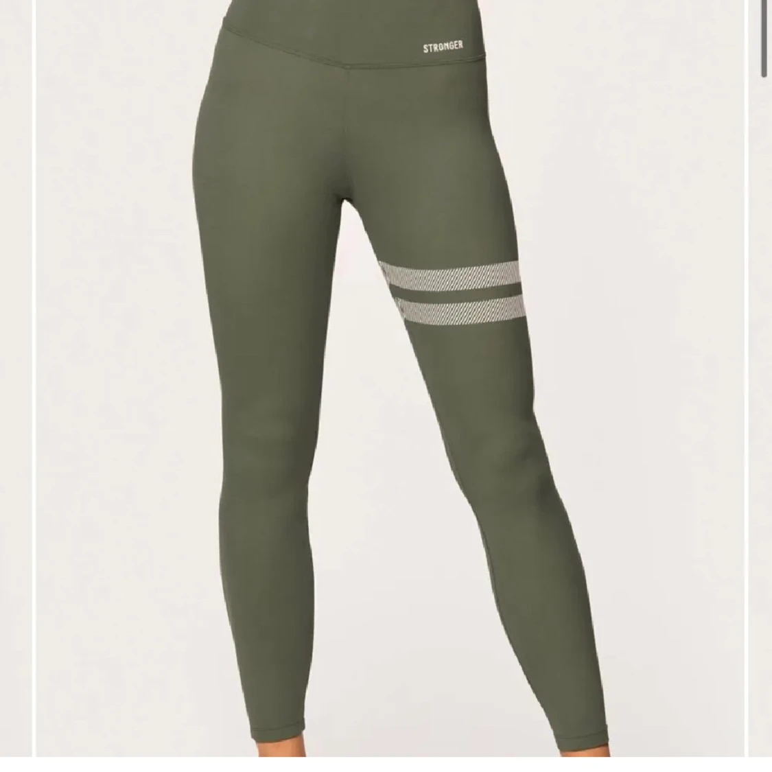 Snygga olivgröna leggings från Stronger med två vita ränder på ena låret. Hög midja och tight passform, perfekta för träning. Tillverkade i stretchigt syntetmaterial som andas. Diskret logga framtill och meshdetaljer på vaderna för extra ventilation. Dessa säljs även inte på jemsidan längre! Nypris - 700
