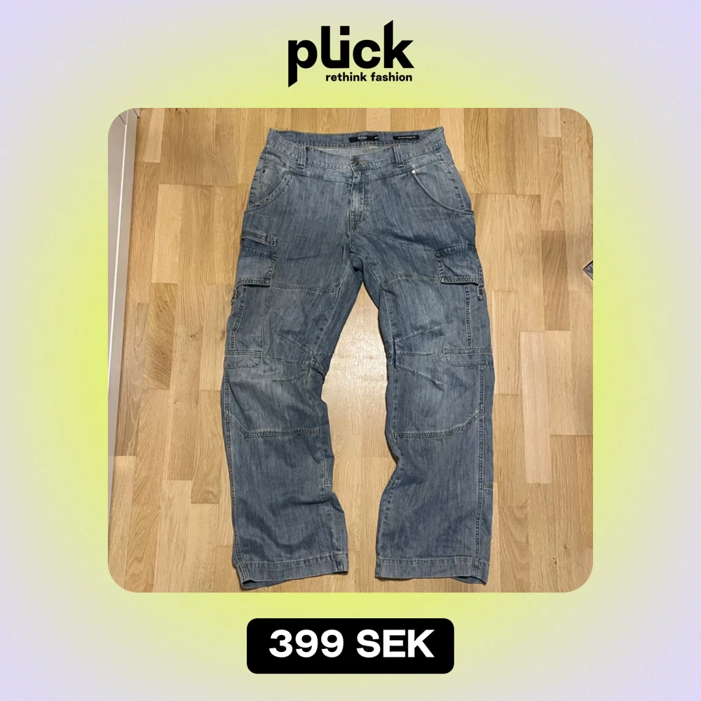 Jaded london jeans med fickor på benen och gula sömmar. Väldigt snygga och i bra skick. Skulle säga att jeansen har bagg/loose passform.