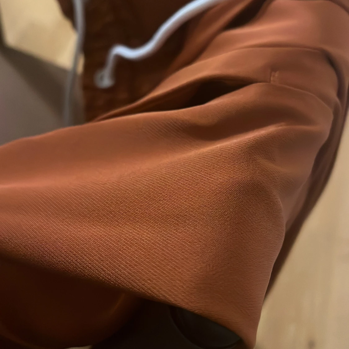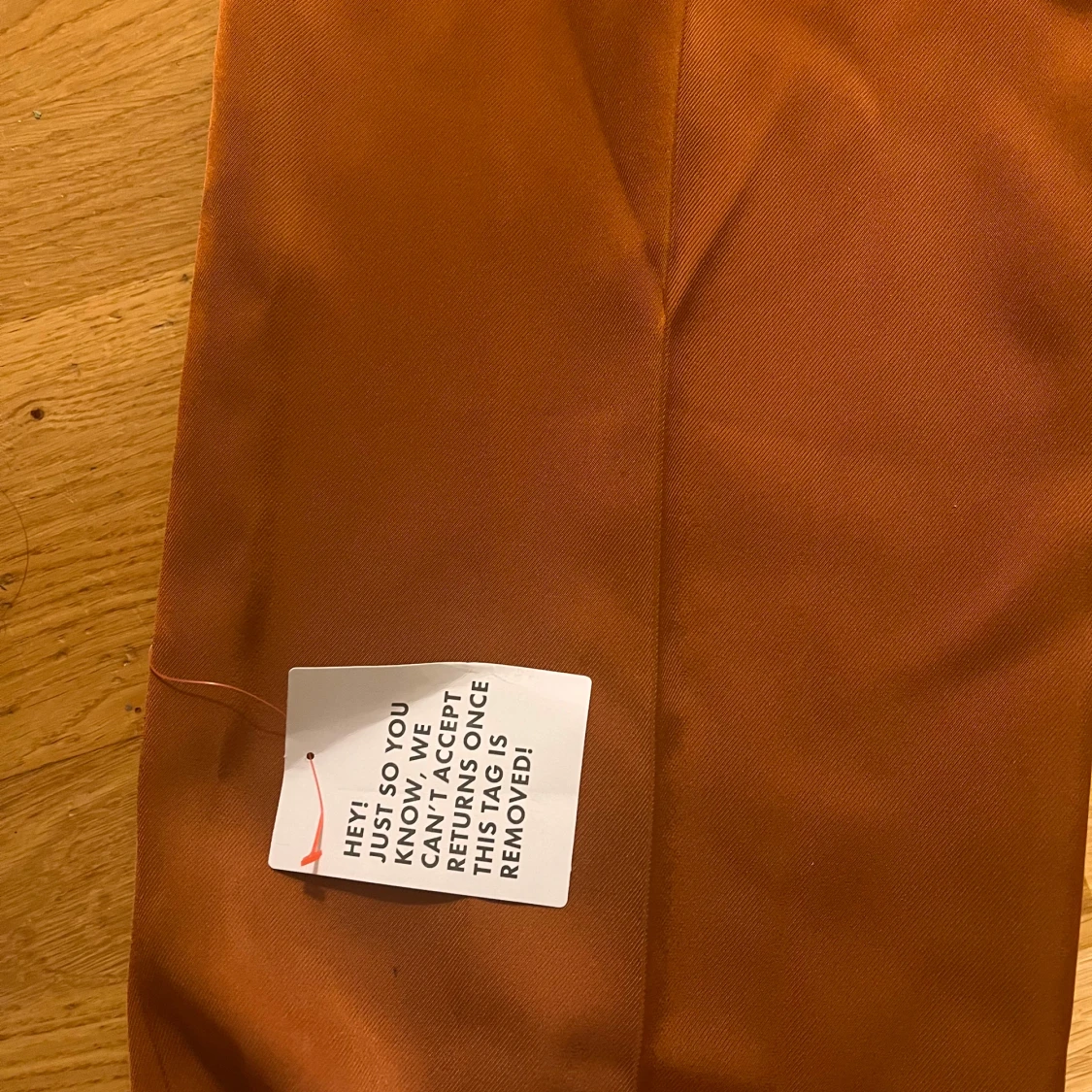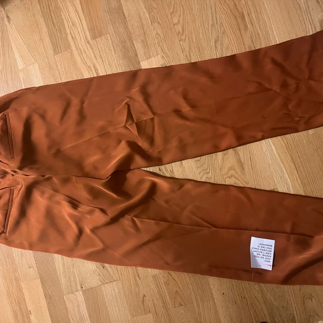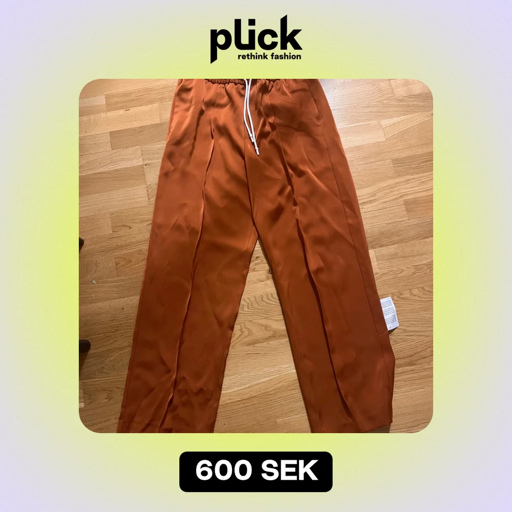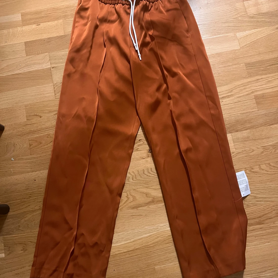 Säljer ett par snygga orange byxor i mycket bra skick. De har en loose passform och är högmidjade med snörning i midjan för extra komfort. Perfekta för höst och vår, och de har en stilren look som funkar både till vardags och fest.