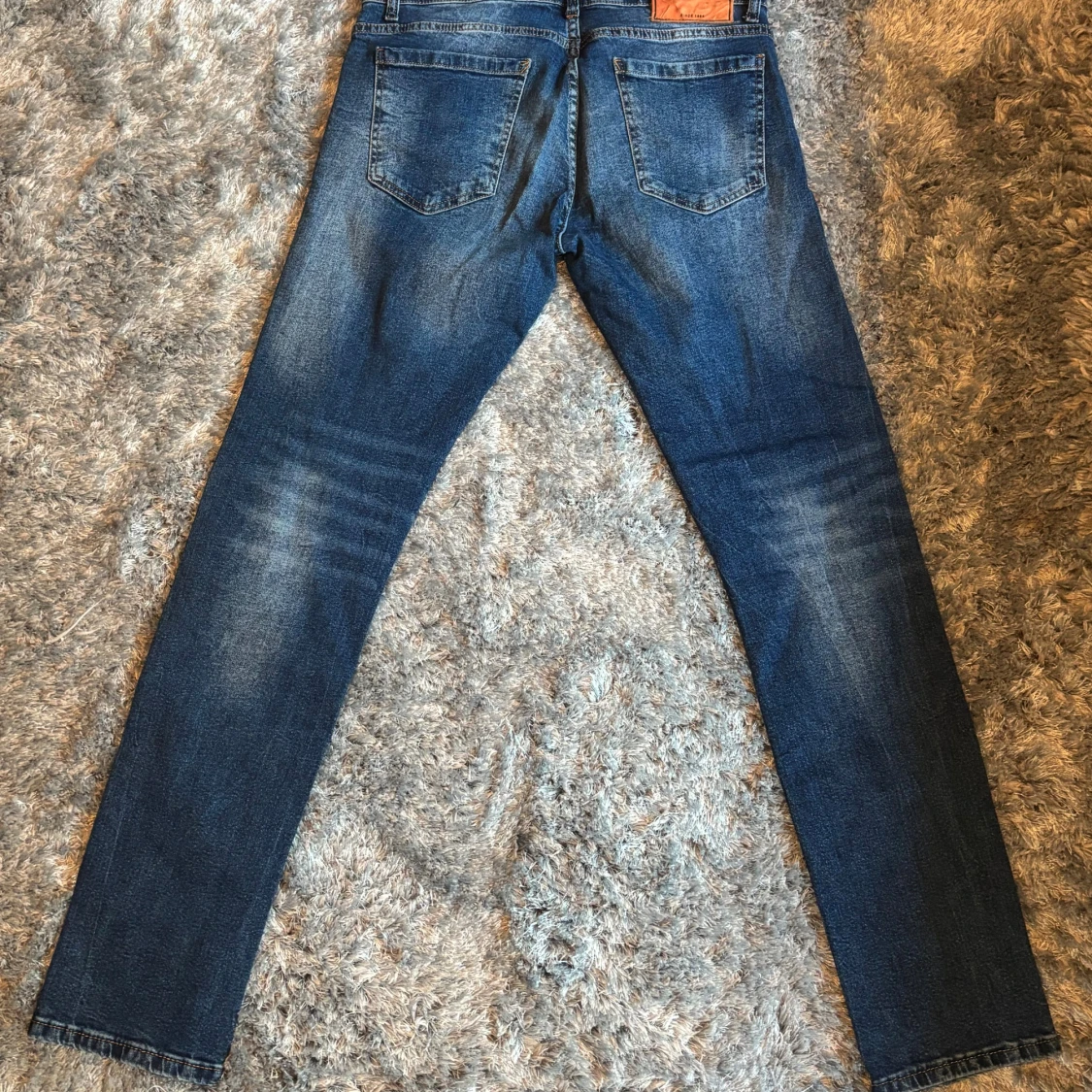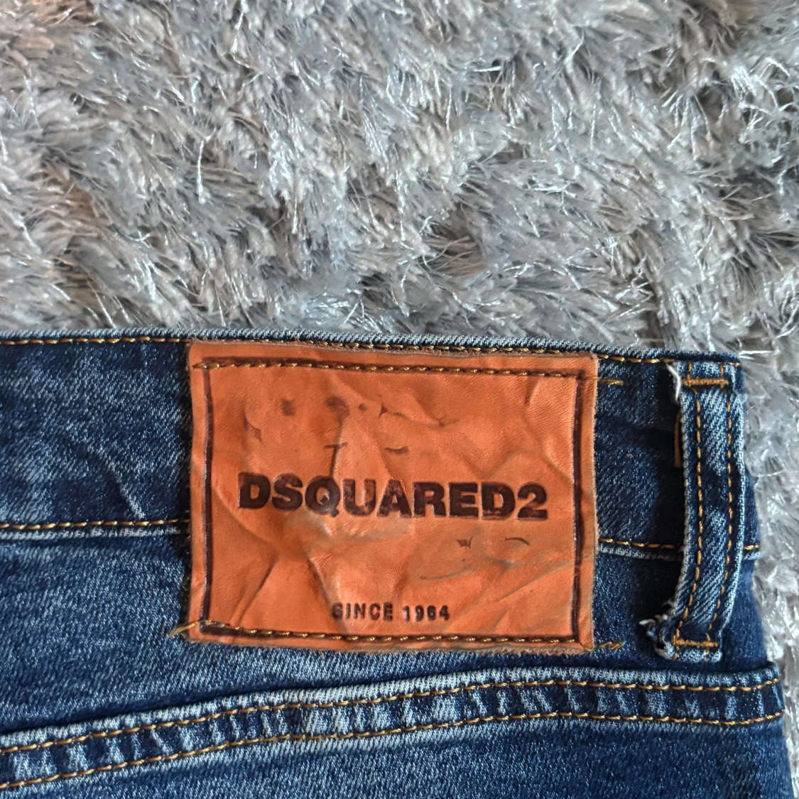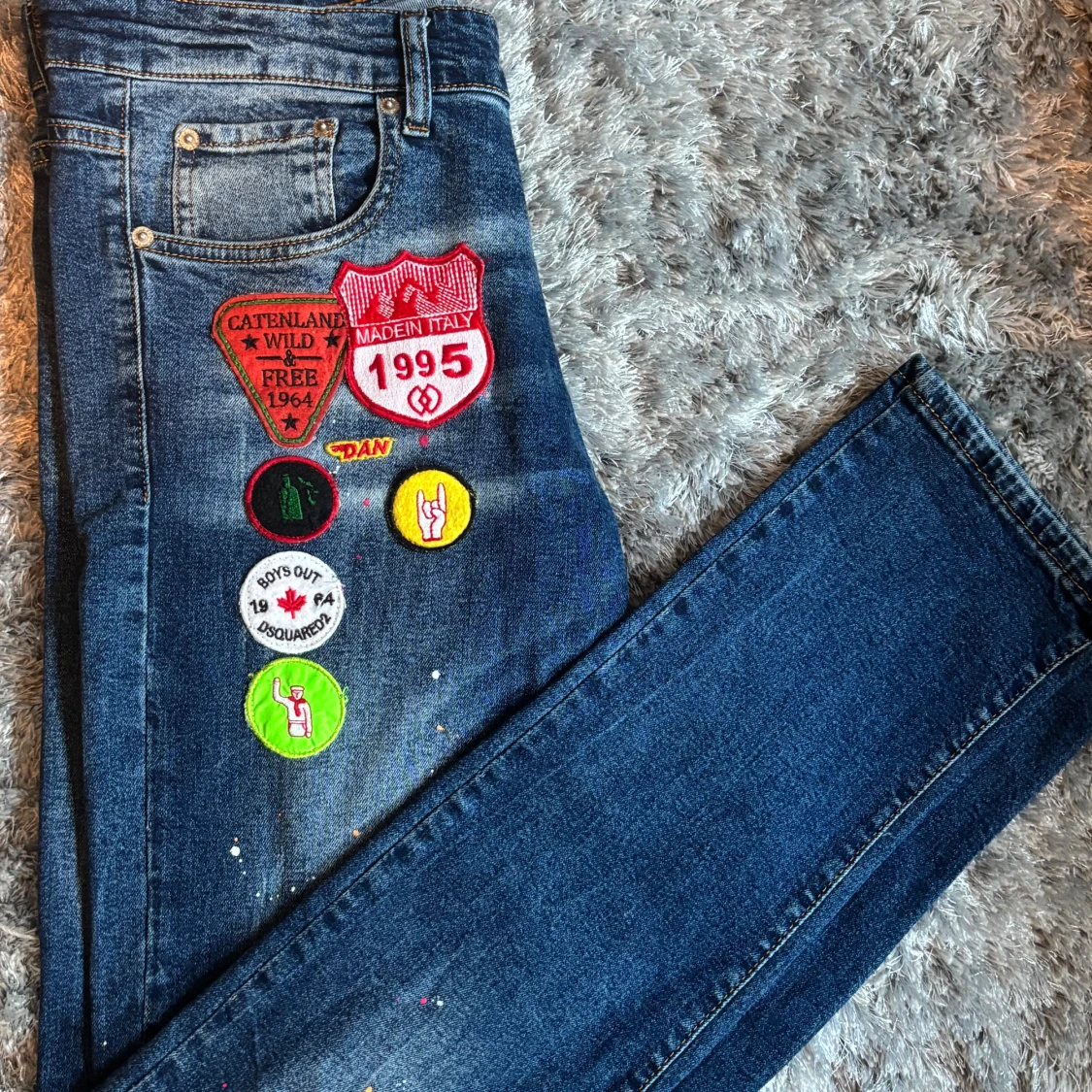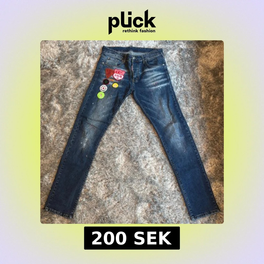 Snygga blå jeans från Dsquared2 med skinny passform. Jeansen har coola broderade patches och färgstänk framtill som ger en unik vibe. Klassisk femficksmodell med läderpatch bak i midjan.