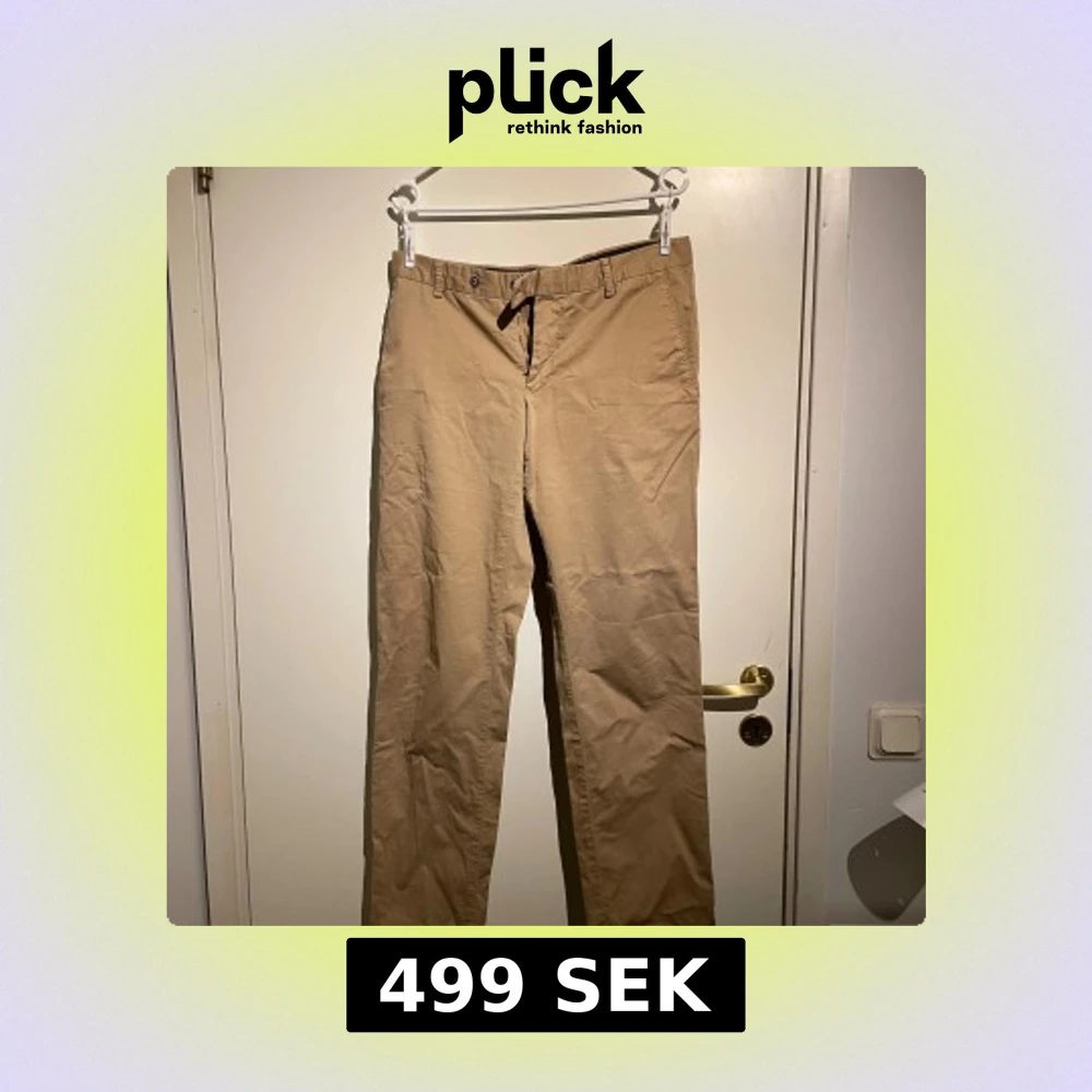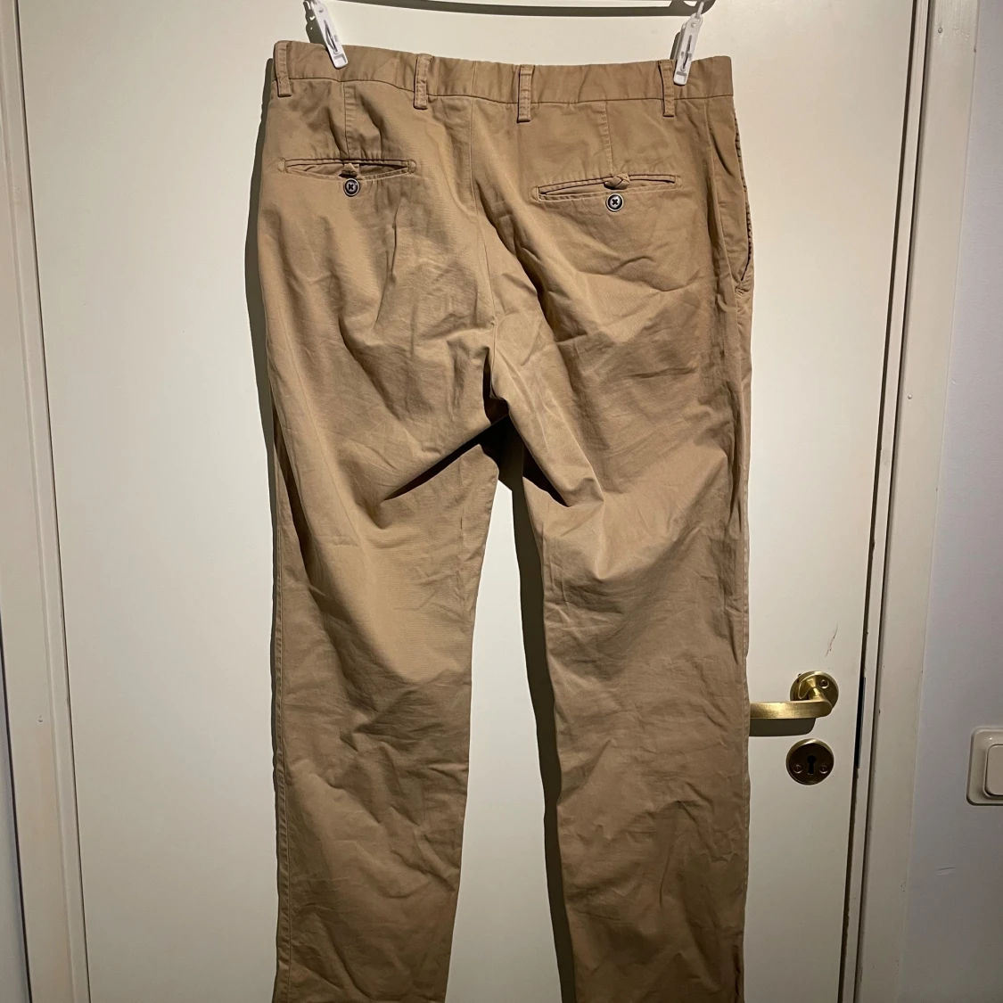 Snygga beiga chinos från Oscar Jacobson med klassisk rak passform. Byxorna har bälteshällor, knappstängning och fickor både fram och bak med knappdetaljer.
