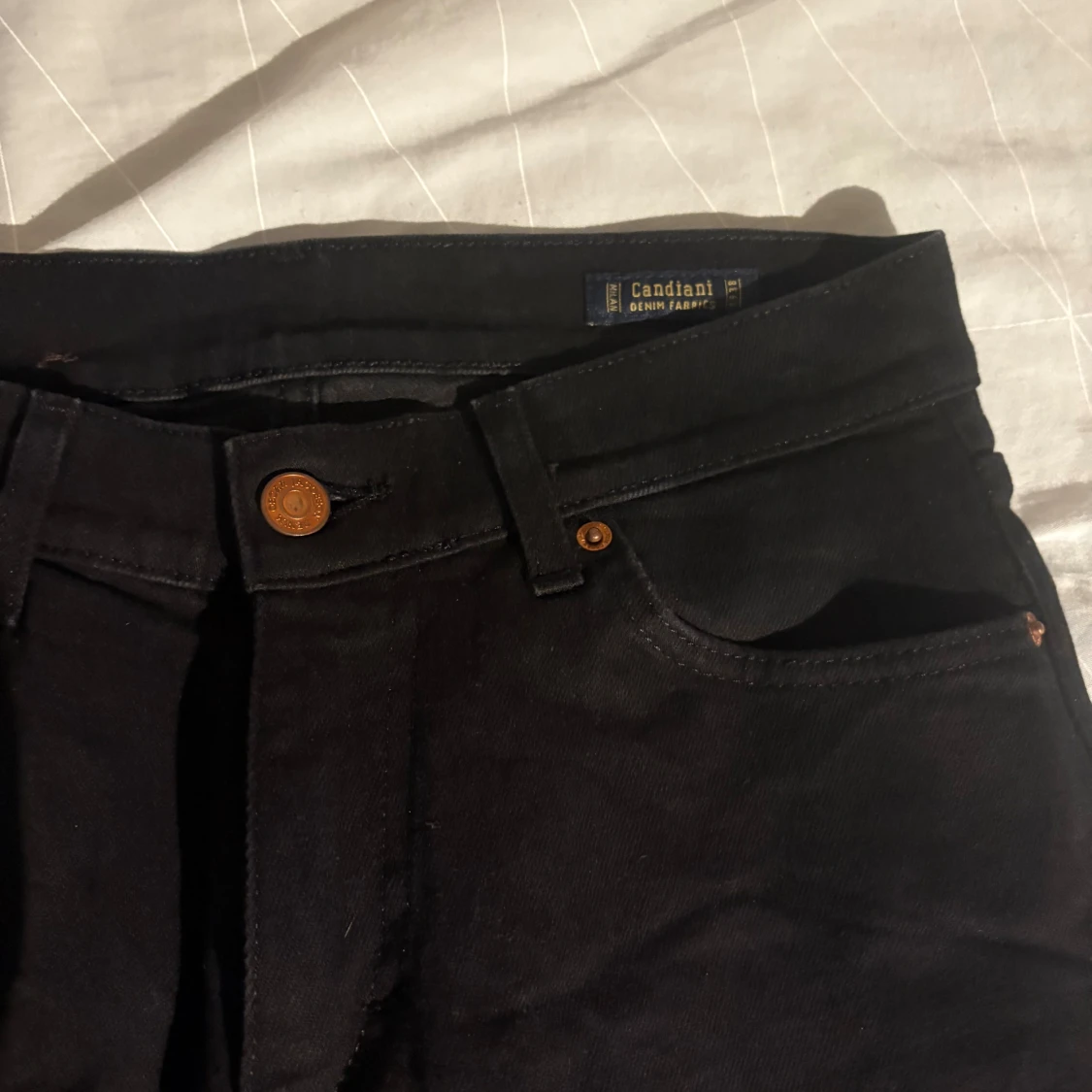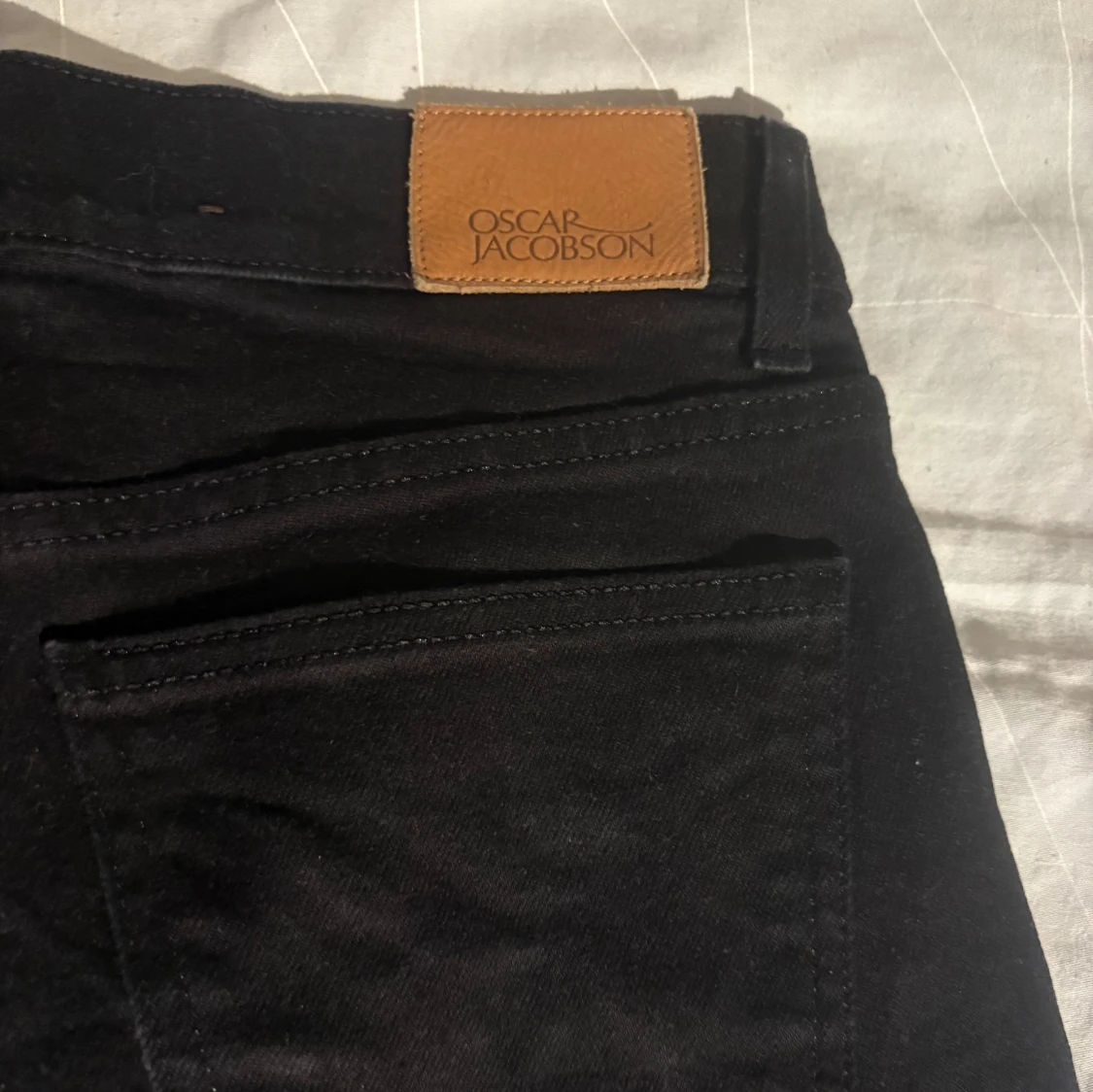Svarta jeans från Oscar Jacobson med klassisk femficksdesign och snygga kopparfärgade nitar. Jeansen har rak passform och är tillverkade i ett slitstarkt bomullstyg från Candiani Denim. Perfekta för dig som gillar stilrena och tidlösa byxor. 29/32