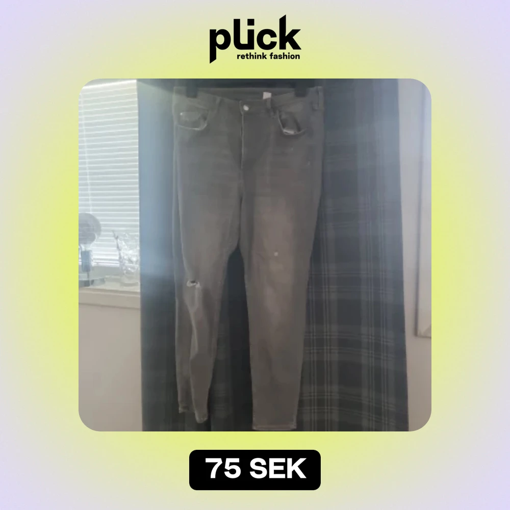 Säljer ett par grå super skinny jeans med ultra hög midja och ankellängd. De är i denim och har en sliten look med hål på ena benet. Perfekta för en cool och avslappnad stil!