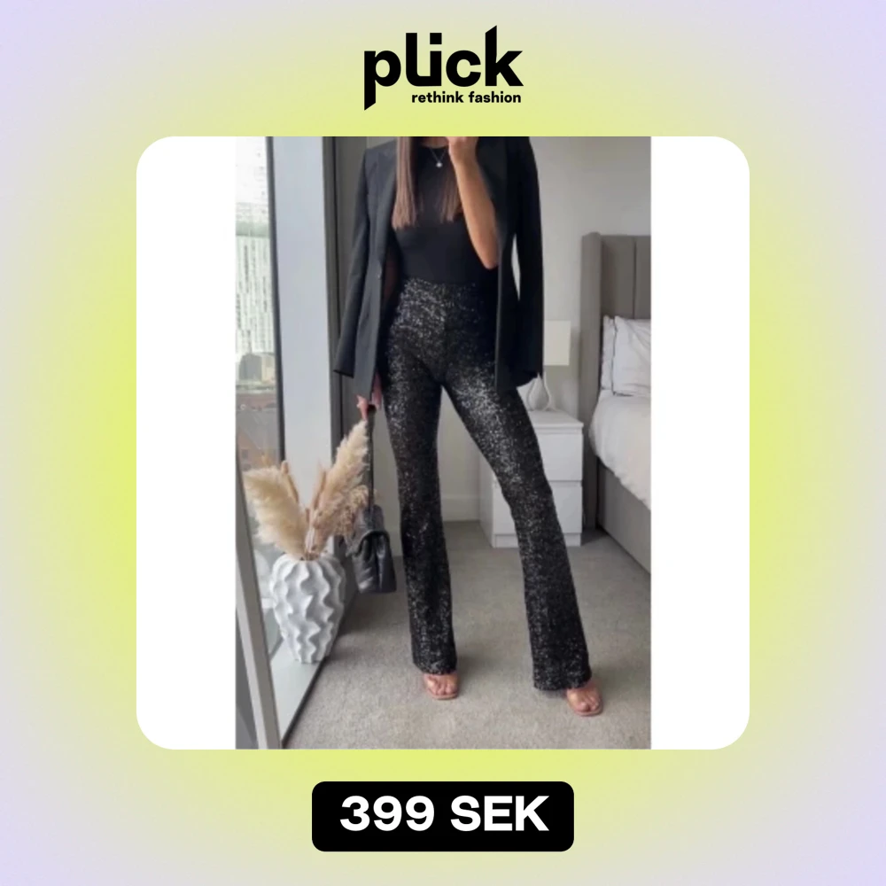 Utsvängda paljettbyxor/leggings från ZARA Har lite stretch i materialet och resårband i midjan. Storlek: S Färg: Svart Skick: Använda ett fåtal ggr, små spår av användning men knappt märkbara, fint skick.