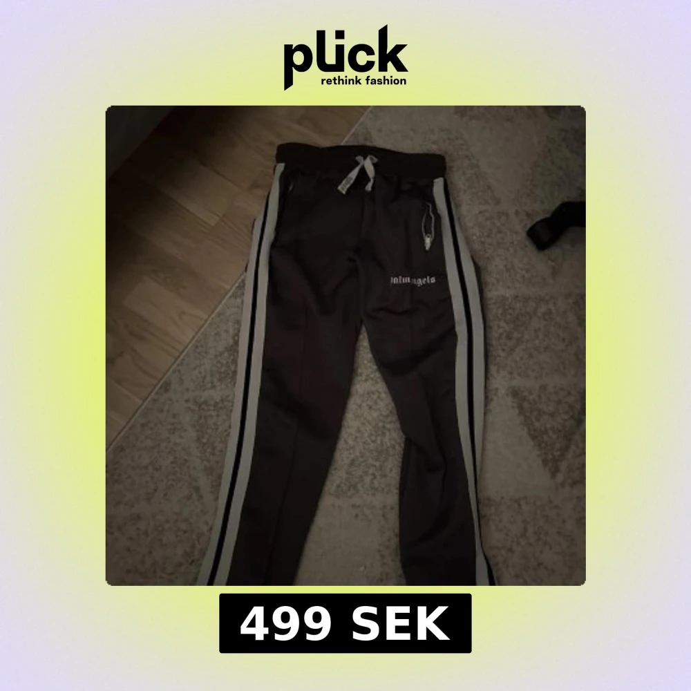 Svarta mjukisbyxor från Palm Angels med vita sidoränder och logga på låret. Byxorna har snörning i midjan och dragkedja vid fickorna. Perfekta för en chill och sportig look.