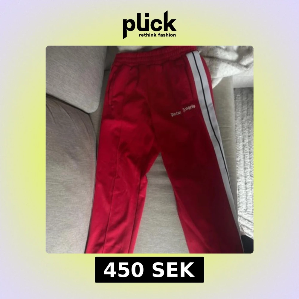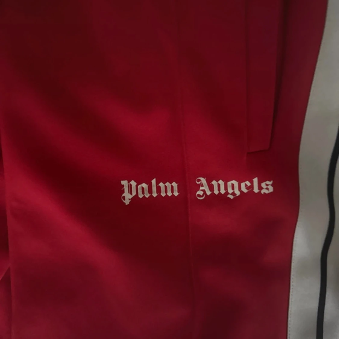 Riktigt snygga röda mjukisbyxor från Palm Angels med vita och svarta revärer längs sidorna. Byxorna har elastisk midja, sidofickor och Palm Angels-logga tryckt på låret. Perfekta för en streetwear-look och superbekväma.