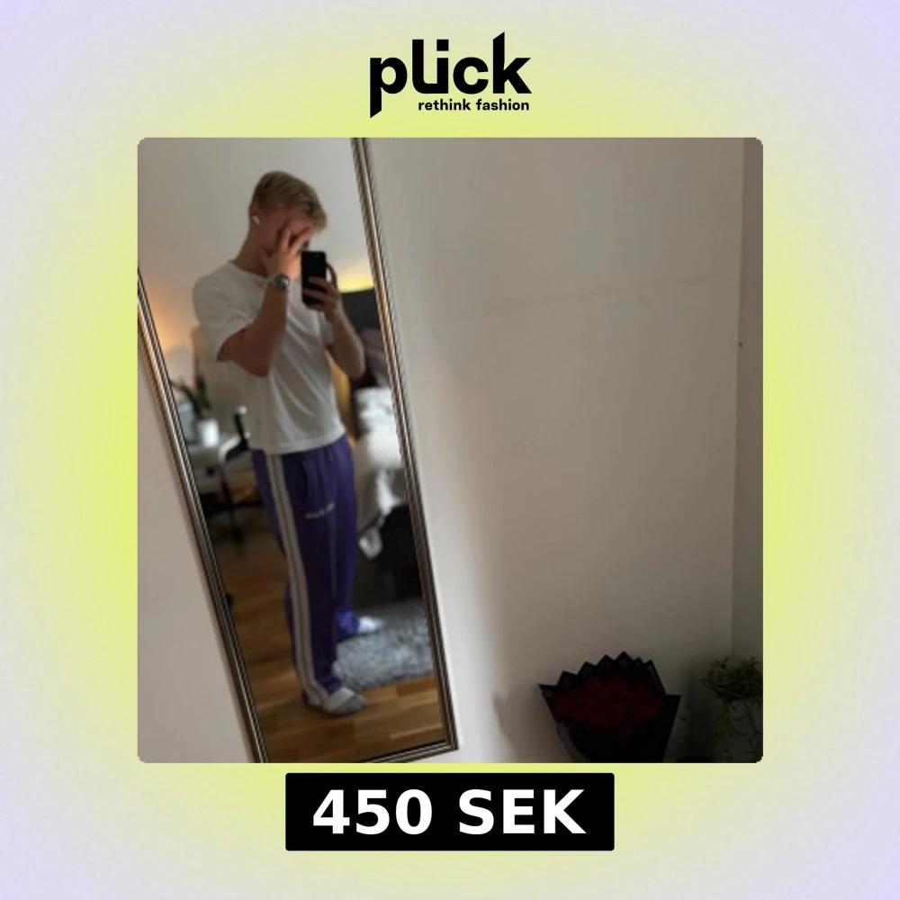 Säljer ett par lila trackpants från Palm Angels med vita sidoränder och elastisk midja. Byxorna har logga tryckt på ena benet och är tillverkade i ett glansigt syntetmaterial. Perfekta för en sportig och trendig look.