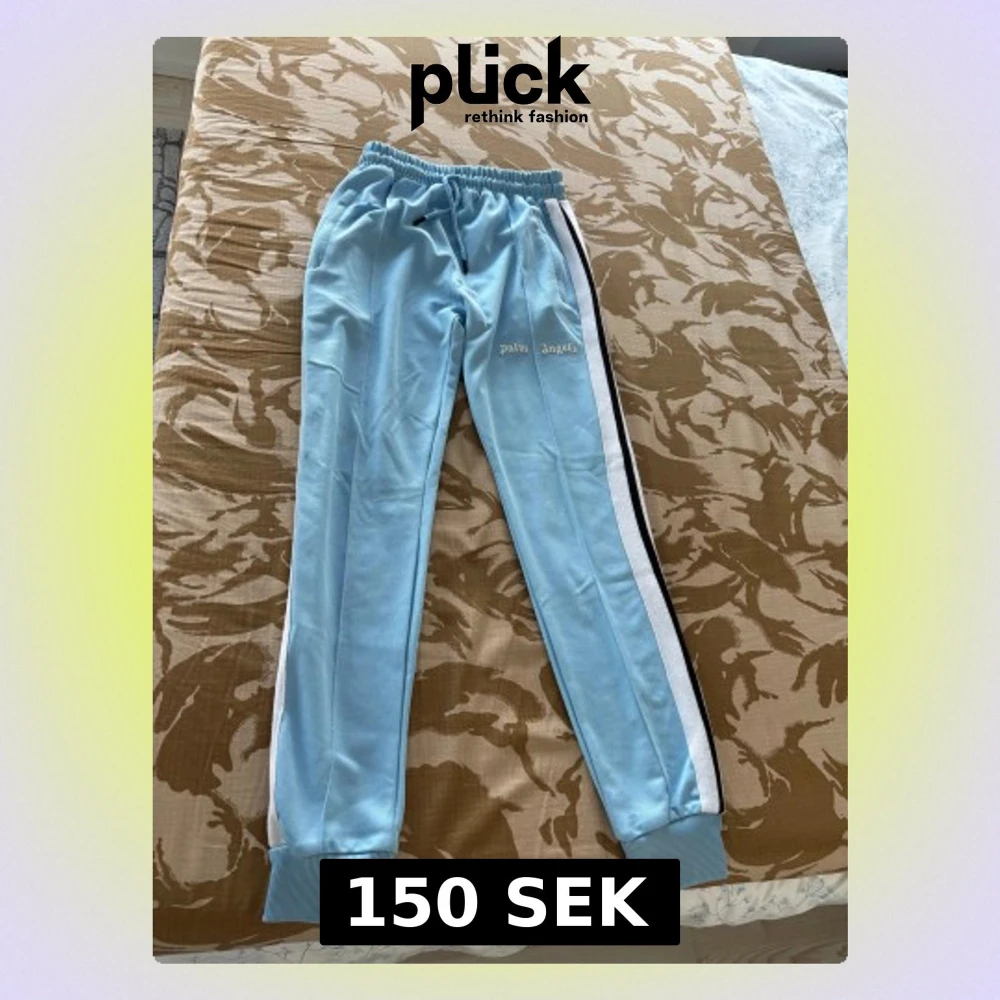 Palm Angels mjukisbyxor i ljusblått med vita och svarta sidoremsor. Byxorna har elastisk midja med snörning och ribbade muddar vid bensluten. Märkets logga är tryckt framtill. Materialet är mjukt och syntetiskt, perfekt för chill eller träning.