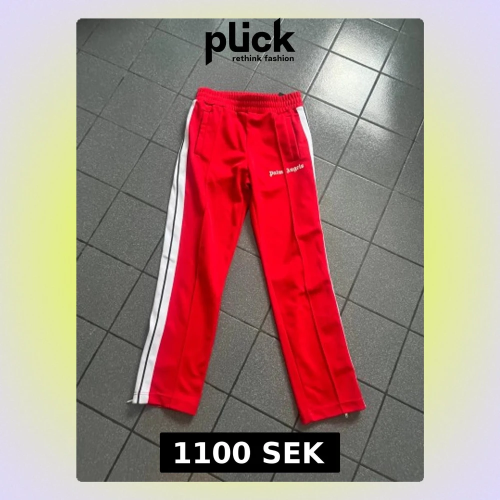 Röda trackpants från Palm Angels med vita sidoränder och logga på låret. Byxorna har elastisk midja, raka ben och är tillverkade i polyester. Perfekta för en sportig och trendig streetwear-look. Storlek M. FINNS KVITTO!!