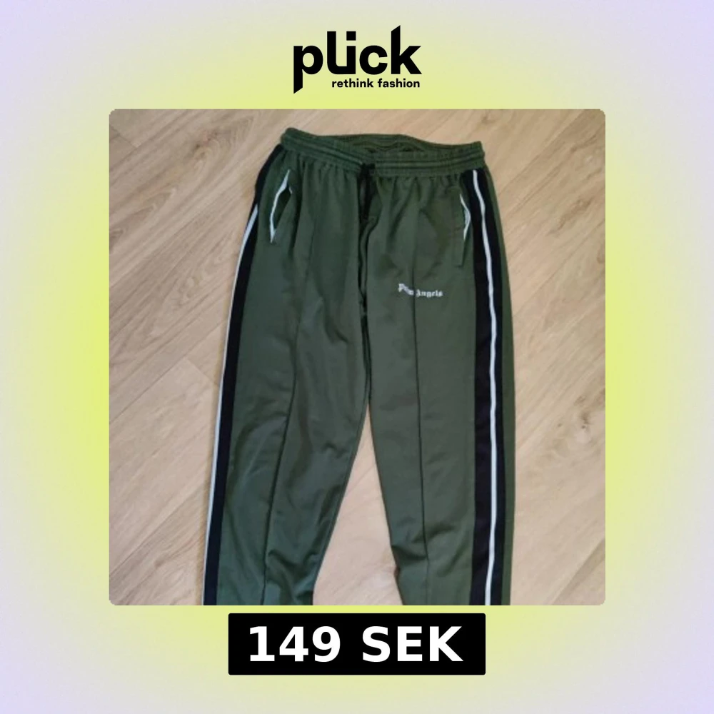 Snygga gröna mjukisbyxor från Palm Angels med svarta och vita ränder längs sidorna. Byxorna har resår och snörning i midjan samt fickor med vit kant. Perfekta för en chill och sportig look.