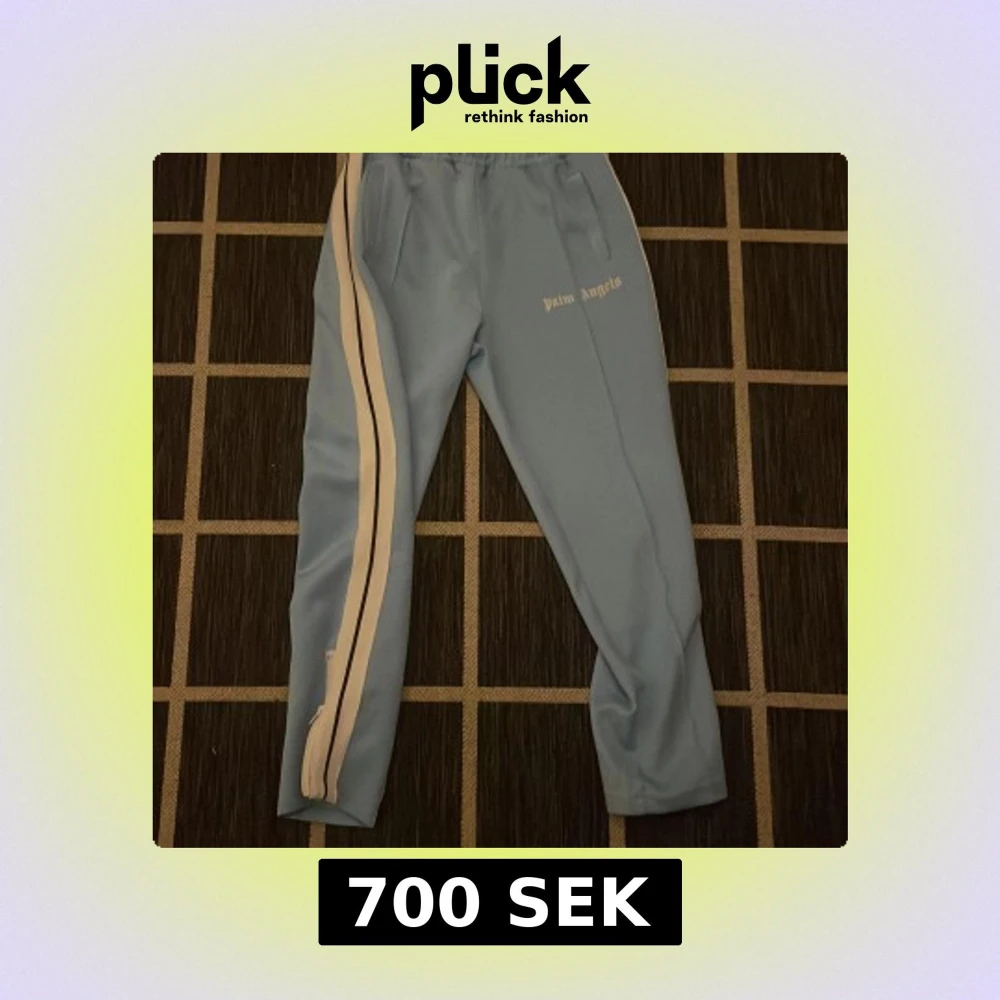 Snygga ljusblå träningsbyxor från Palm Angels med vita och svarta ränder längs sidorna. Byxorna har elastisk midja med snörning och dragkedjor vid bensluten för en justerbar passform. Säljer dom då jag ej har användning till dom mer priset kan diskuteras tar trades .