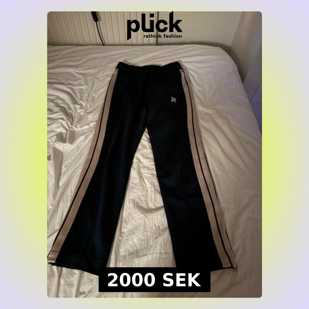 Palm Angels sweatpants i mörkblått med broderat monogram på framsidan. Byxorna har raka ben, beige sidoremsor och dragkedja vid benslut. Elastisk midja för skön passform. Liten defekt på vänster knä, men syns inte på långt avstånd. Priset går att diskutera!