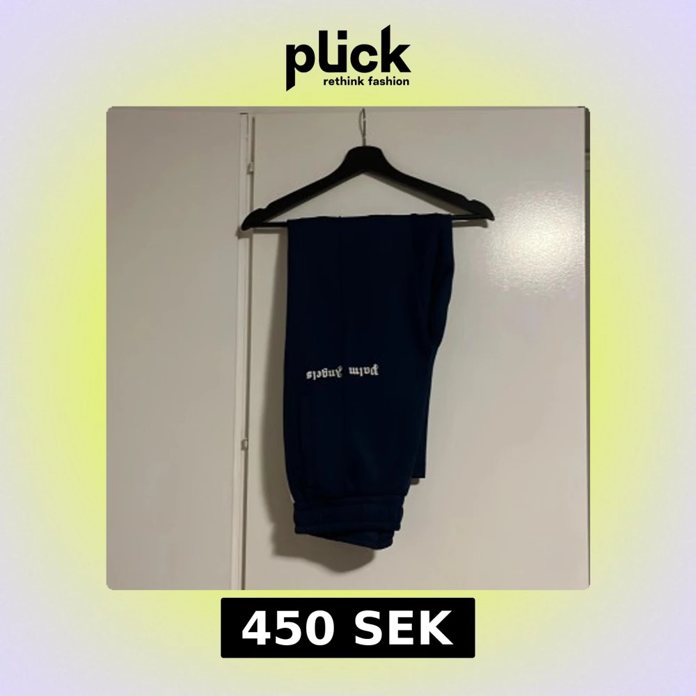 Säljer ett par mörkblå mjukisbyxor från Palm Angels med vit logga på benet och vita ränder längs sidorna. Byxorna har resår vid benslut och sidofickor, perfekt för en chill och sportig look.