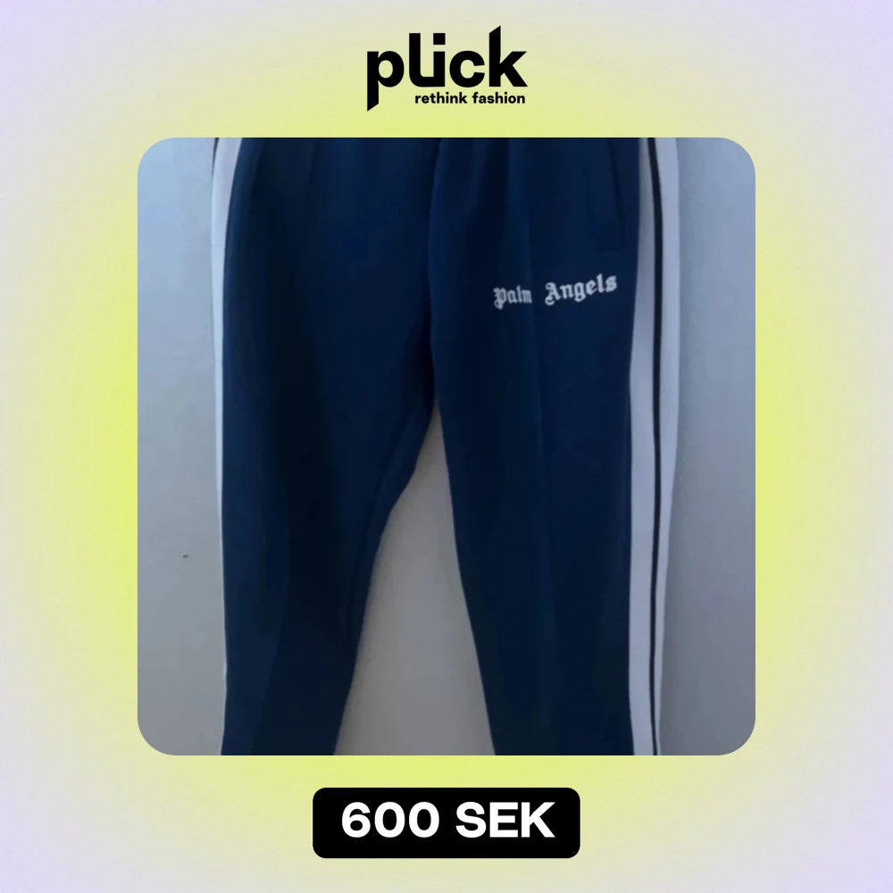 Säljer ett par snygga navy blå byxor från Palm Angels. De har vita ränder längs sidorna och en elastisk midja för extra komfort. Perfekta för både träning och vardagsbruk. Byxorna har en avslappnad passform och är i mycket bra skick. 1,1