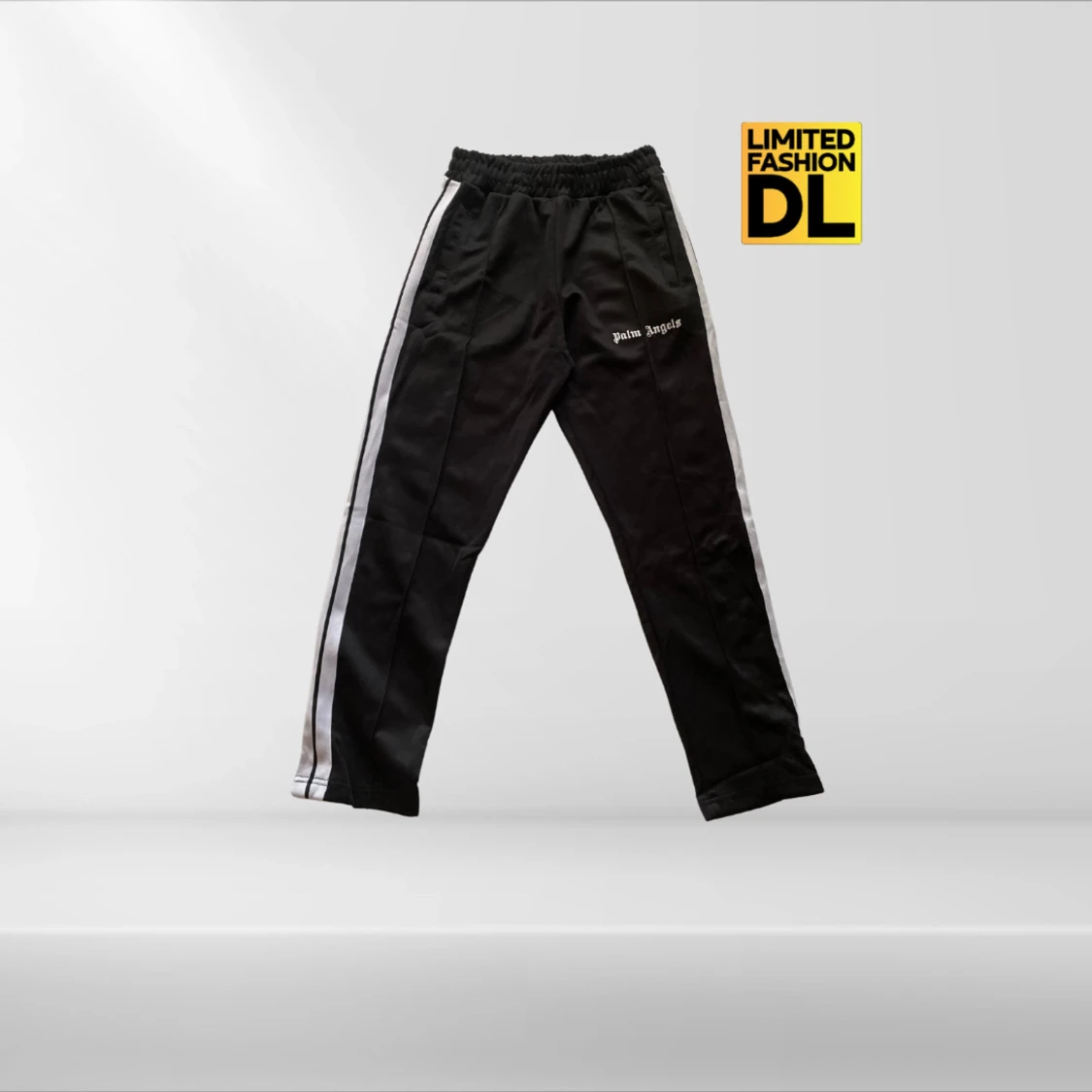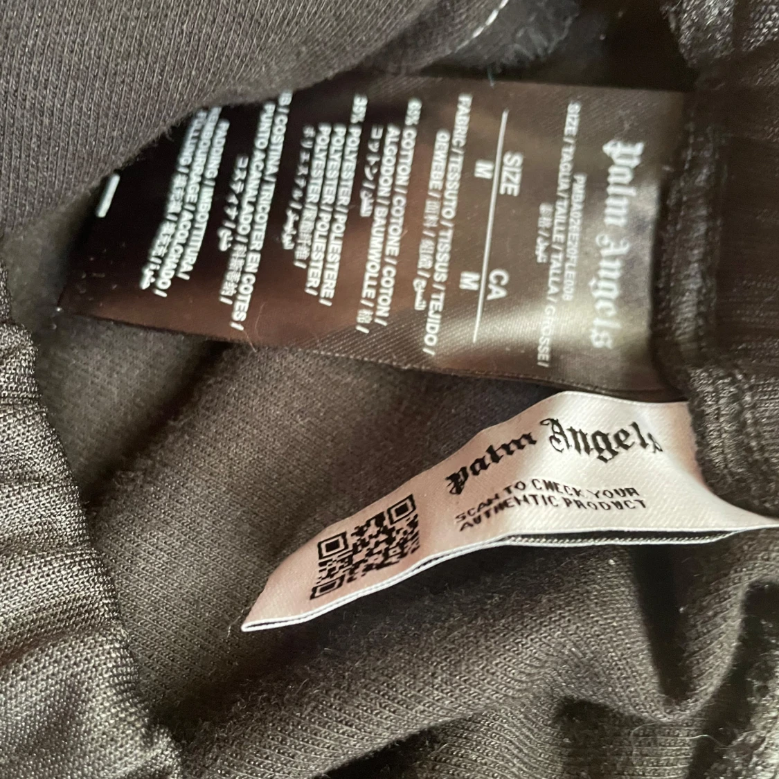 Svarta mjukisbyxor från Palm Angels i storlek M. Byxorna har vita ränder längs sidorna, elastisk midja och logga broderad på ena benet. Materialet är en mix av bomull och polyester för skön känsla och streetwear-vibe. Små i storlek