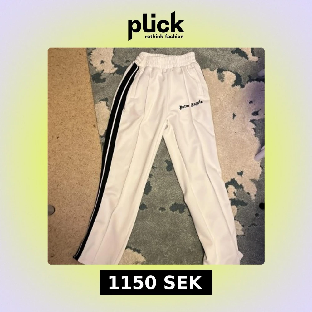 Säljer ett par vita byxor från Palm Angels med svarta ränder längs sidorna och elastisk midja. Byxorna har rak passform och logga broderad framtill. Perfekta för en sportig och trendig look.