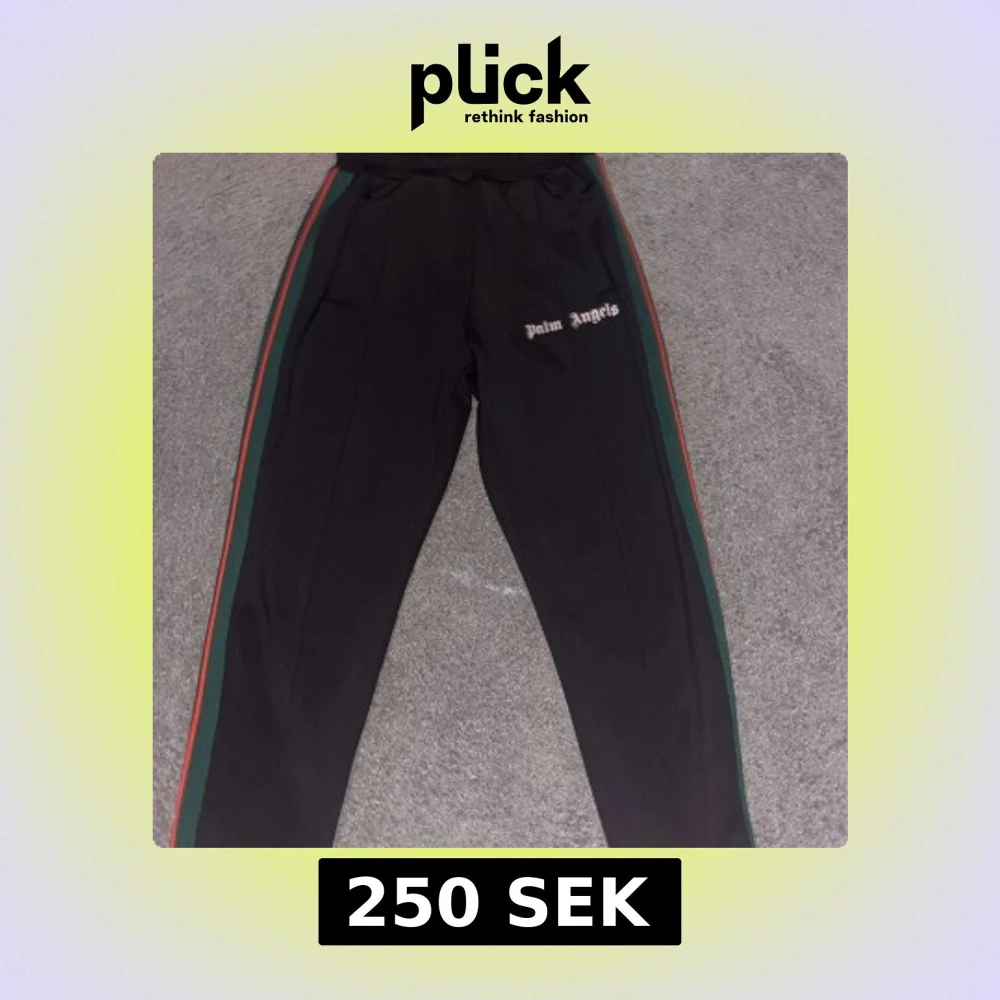 Svarta byxor från Palm Angels med gröna och röda ränder längs sidorna. Byxorna har elastisk midja och broderad Palm Angels-logga på framsidan. Materialet är glansigt och känns sportigt, perfekt för en streetwear-look.
