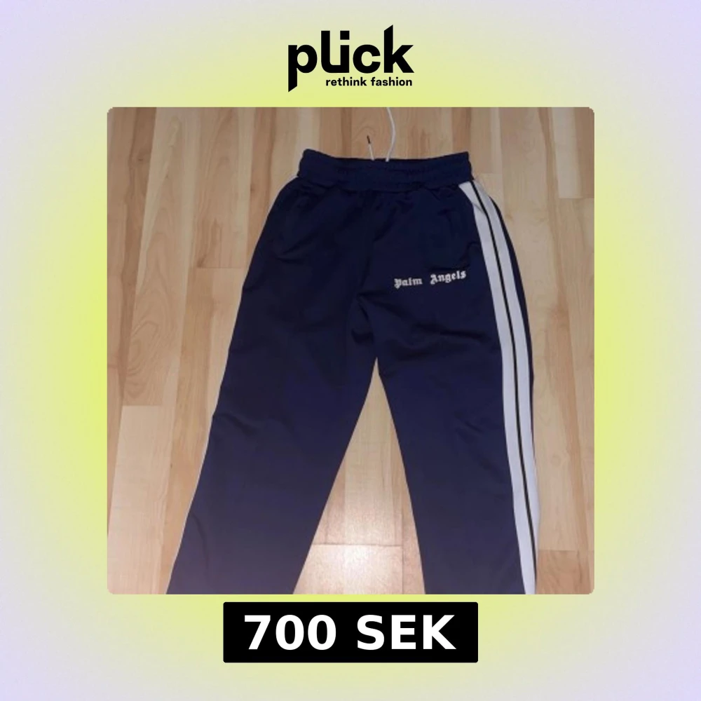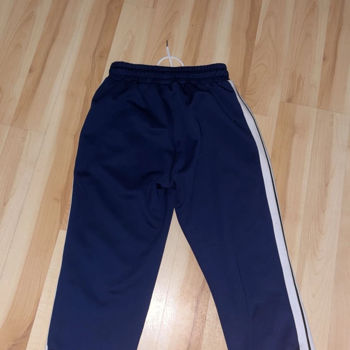 Mörkblå byxor från Palm Angels med vita sidoränder och logga på vänster ben. Byxorna har resår i midjan med snörning och är gjorda i 100% polyester. Perfekta för en sportig och trendig look.